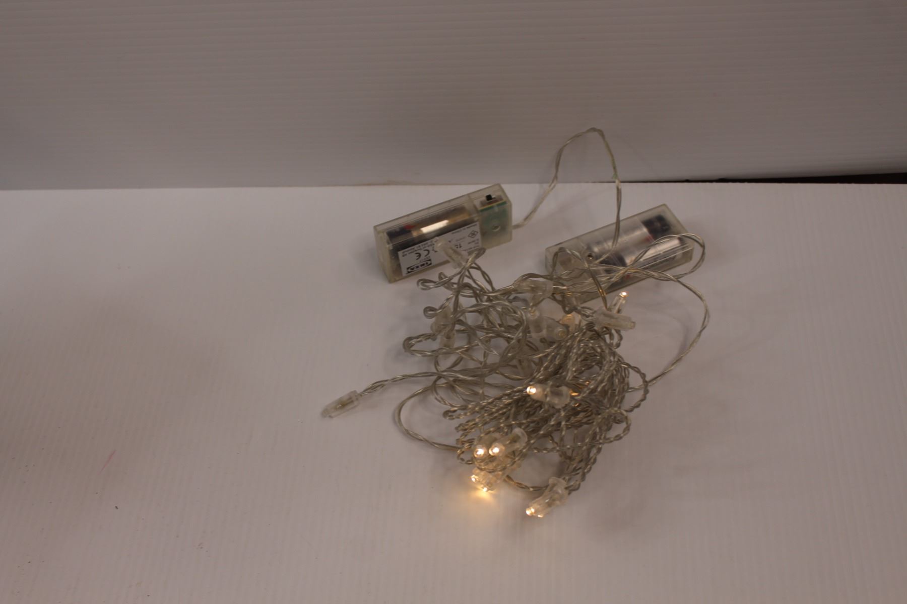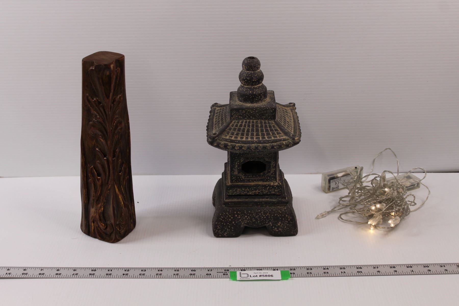 Carved Piece of Wood, Asian Inspired Clay/Terracotta Tea Light Holder & (2) Lengths Battery String Lights
