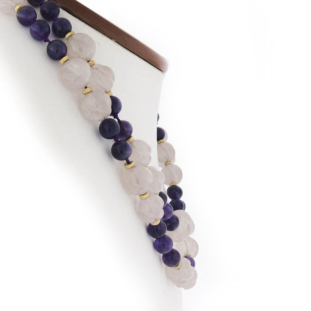Alternated carved pink quartz (11.1-12.3mm), with round natural amethysts (8-8.2mm), and 14k yellow gold spacers strand necklace. It weighs a total of 102.74 grams, measures 12.3mm wide, and measures 34 inches in length.