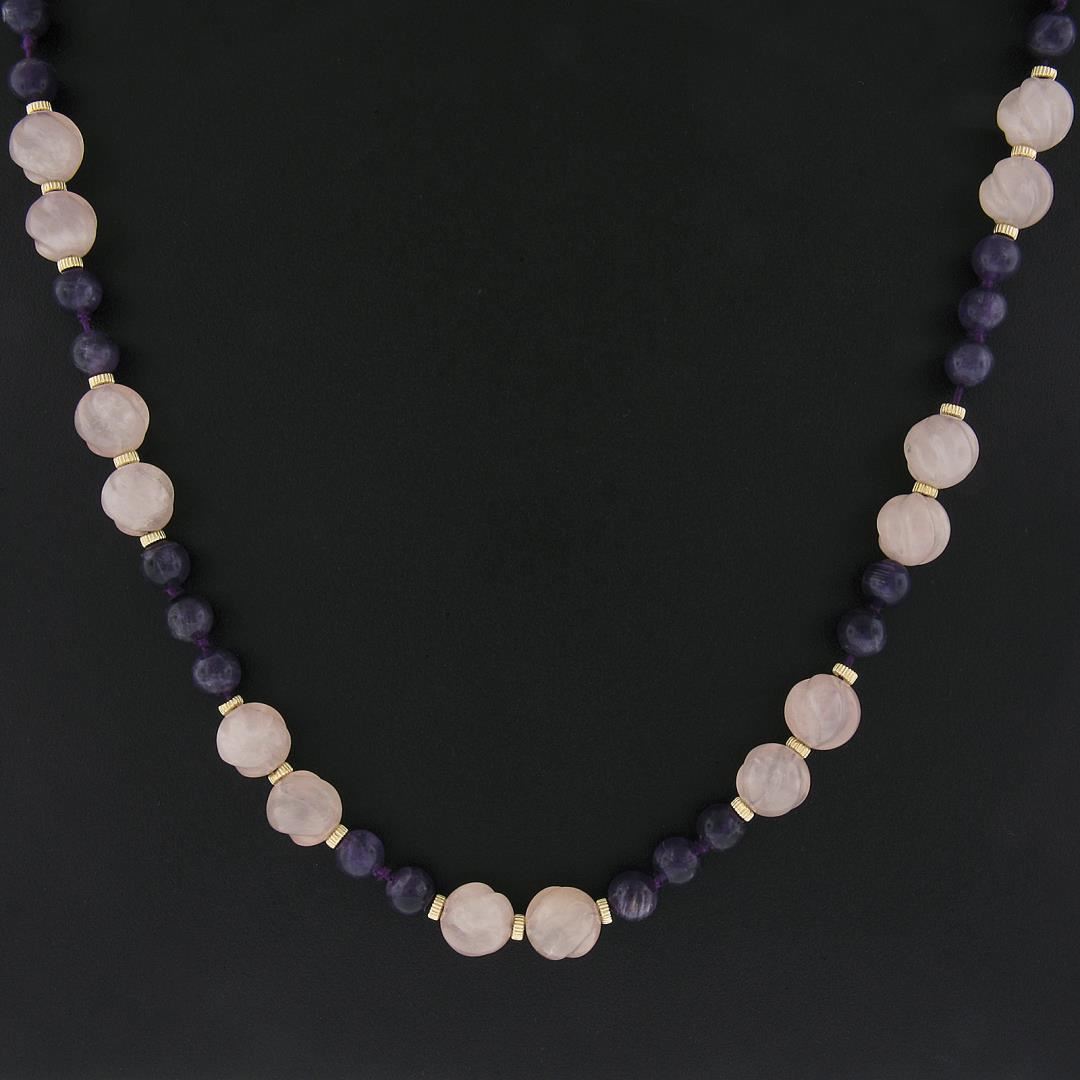 Alternated carved pink quartz (11.1-12.3mm), with round natural amethysts (8-8.2mm), and 14k yellow gold spacers strand necklace. It weighs a total of 102.74 grams, measures 12.3mm wide, and measures 34 inches in length.