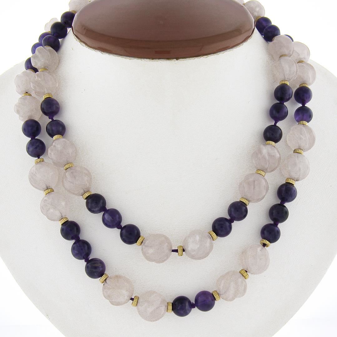 Alternated carved pink quartz (11.1-12.3mm), with round natural amethysts (8-8.2mm), and 14k yellow gold spacers strand necklace. It weighs a total of 102.74 grams, measures 12.3mm wide, and measures 34 inches in length.