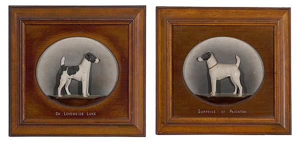 English, ca 1910-25. Two oval relief carved wooden plaques of identified Smooth Fox Terriers, Eng. Ch. Levenside Luke, and Surprise of Paignton. Partial label on verso identifies the carver as J. Hardman/canine carver probably James A. Hardman (act.c. 1916). In matching mahogany period frames; each 8.75" high x 7.25" wide (sight).