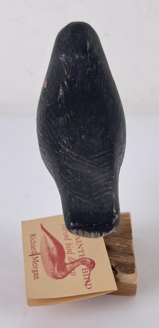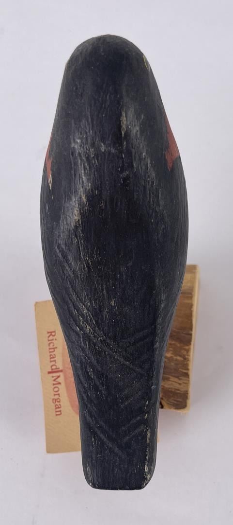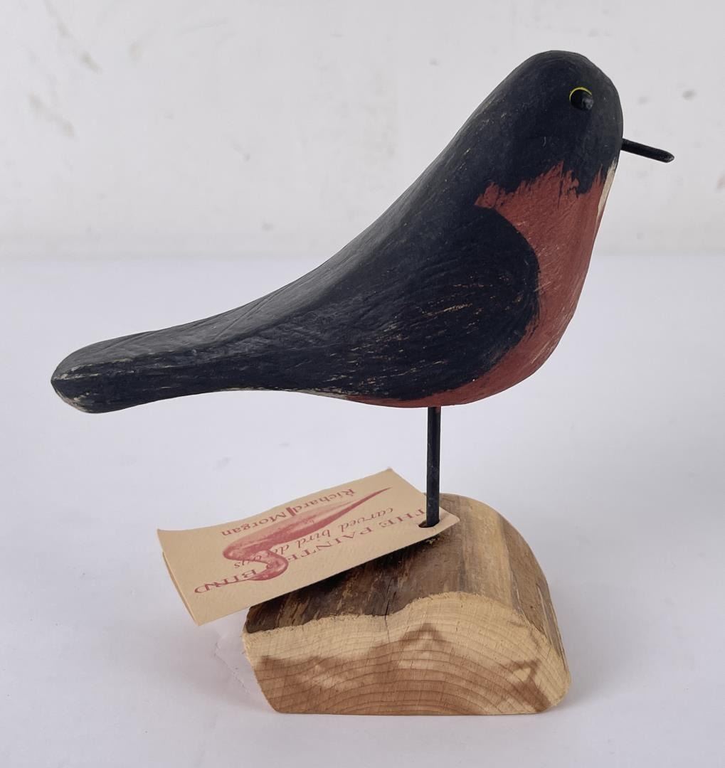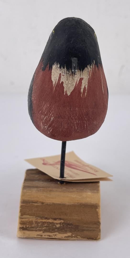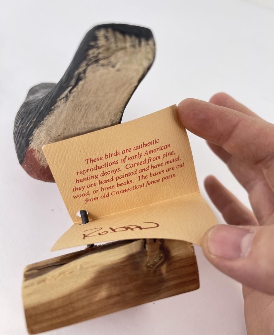 Authentic reproduction of early American hunting decoys. Carved from pine, they are hand-painted and have metal, wood or bone beaks. The bases are cut from old Connecticut fence posts. Approximately 5 1/2" tall.