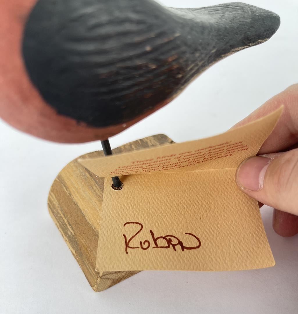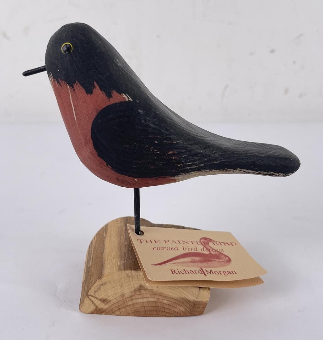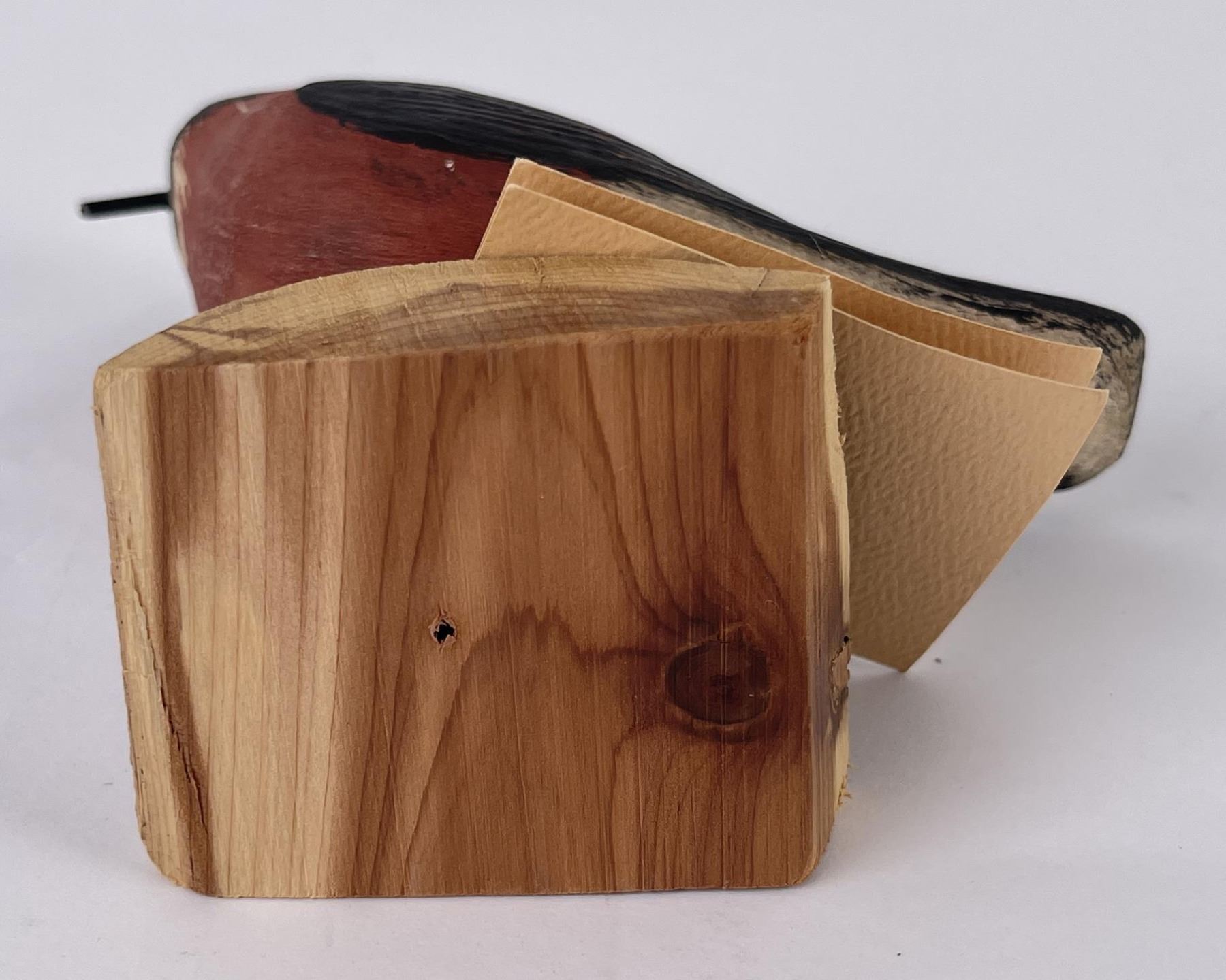 Authentic reproduction of early American hunting decoys. Carved from pine, they are hand-painted and have metal, wood or bone beaks. The bases are cut from old Connecticut fence posts. Approximately 5 1/2" tall.