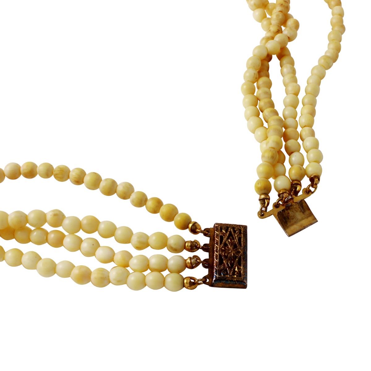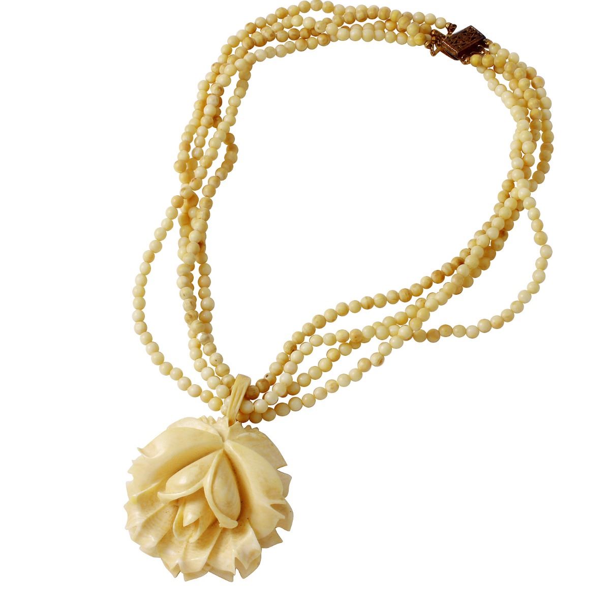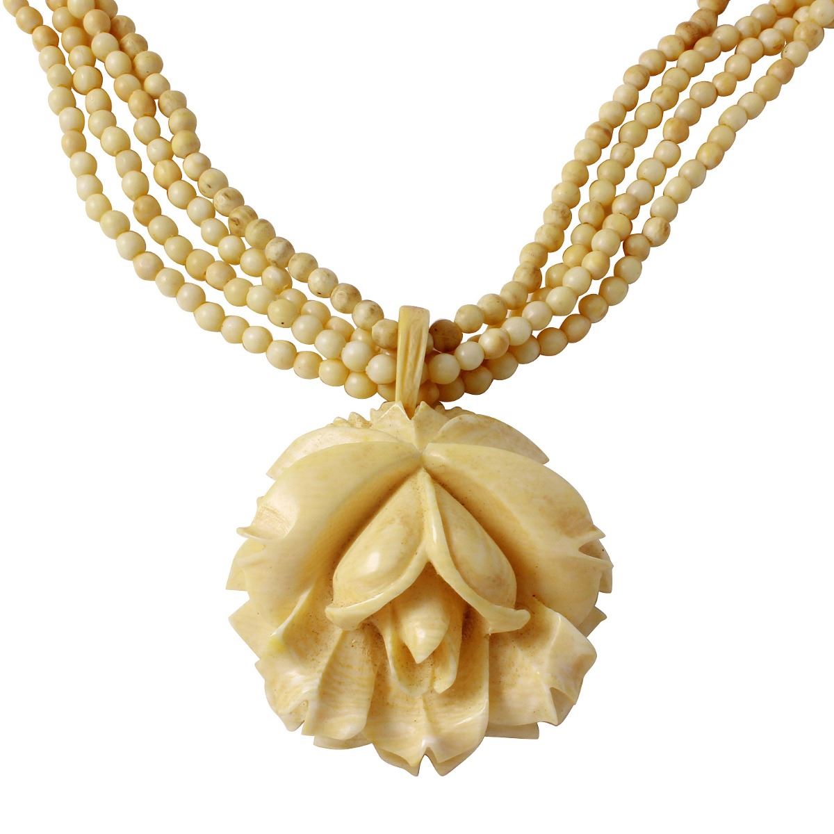 Four strand row beaded necklace that measures 14 inches in length. Created with bone beads strung on a sturdy cord, and meet at the metal toned hidden box clasp, finished with intricate carving details throughout. The descriptions listed should not be construed as an appraisal. The detail is provided as a guideline for color, clarity, weights and measurements to the best of our ability. We welcome inspections. WE SHIP WORLDWIDE!