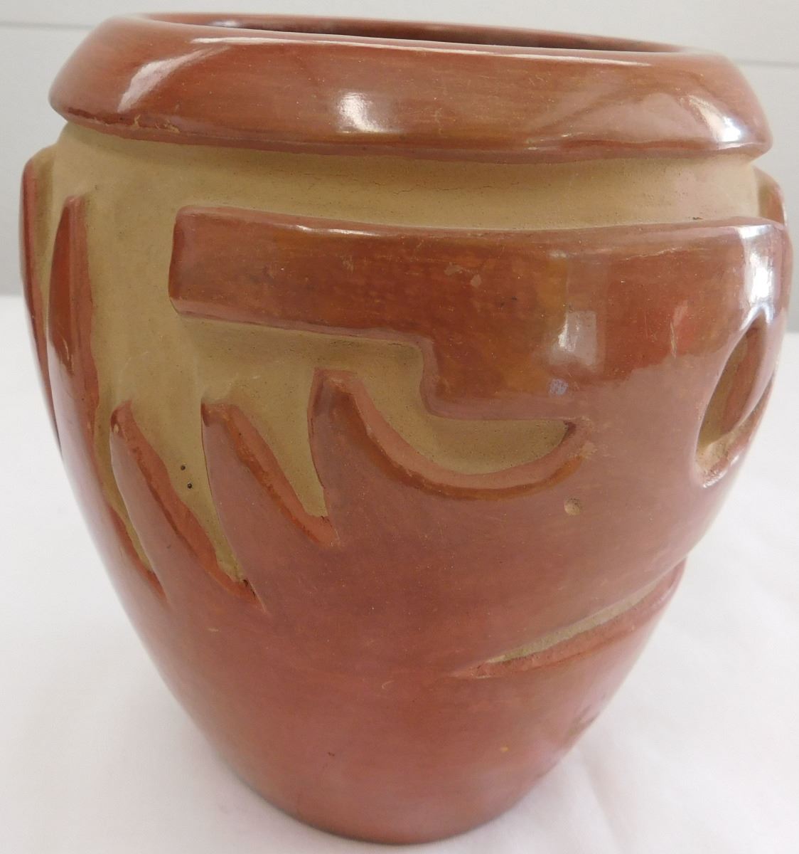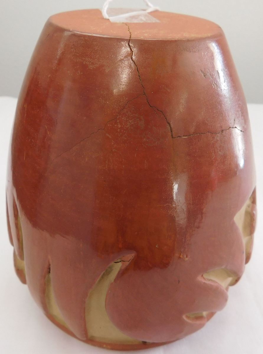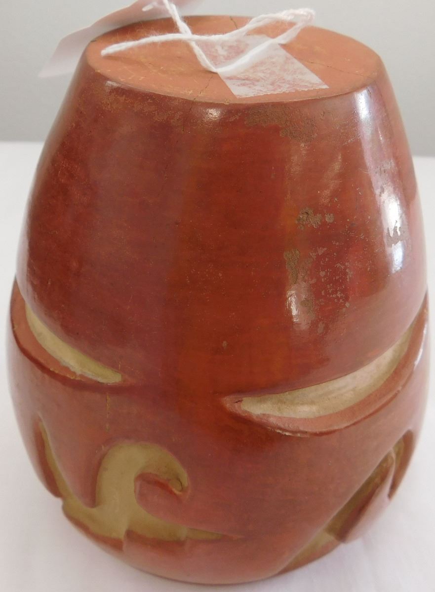 Carved Santa Clara Olla believed to be from the 1960s. Item measures 5 1/2 x 5 inches and is made from clay and paint. Condition: There is a crack on the bottom, see images. Shipping: $19.00, must be double boxed.