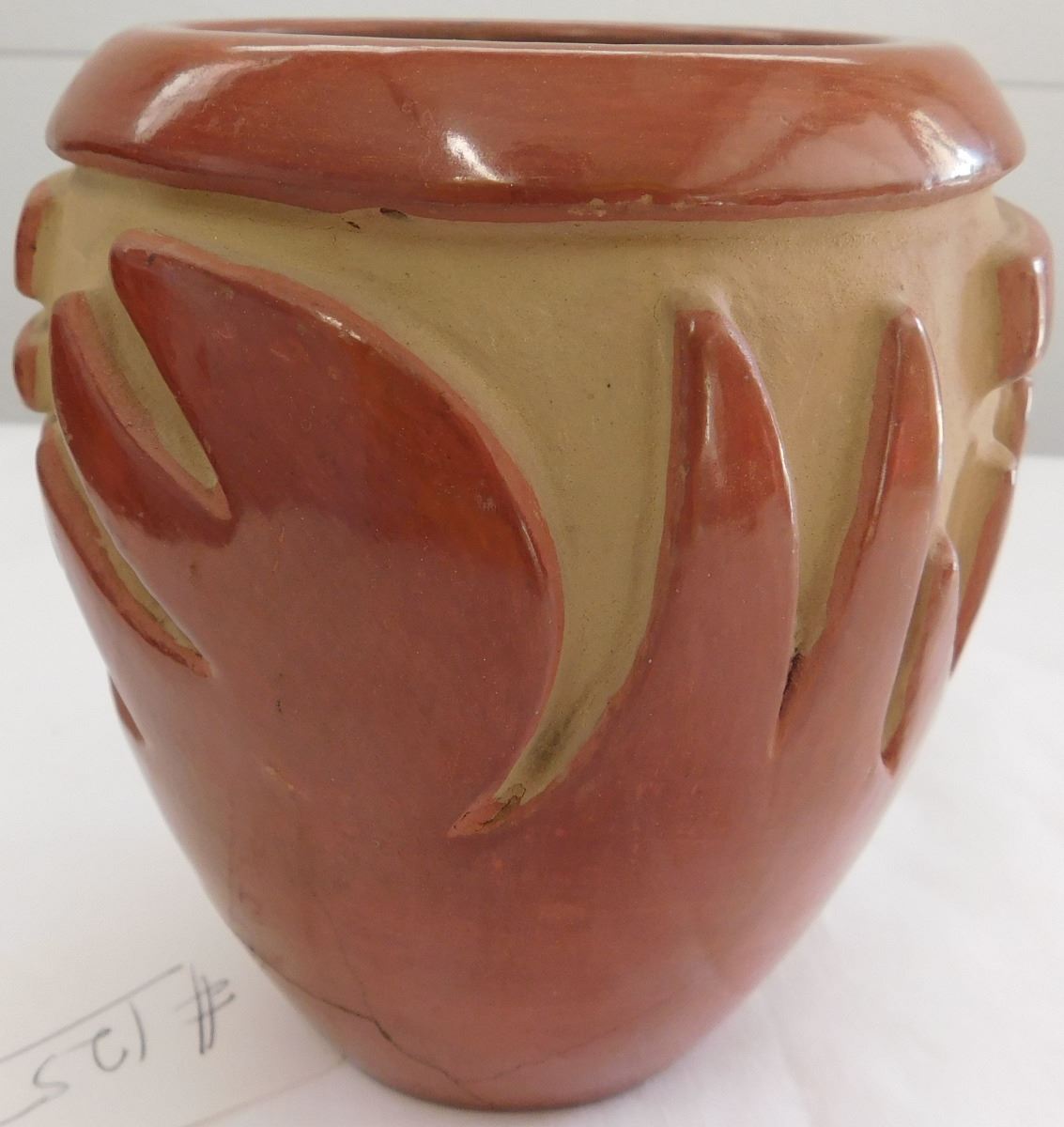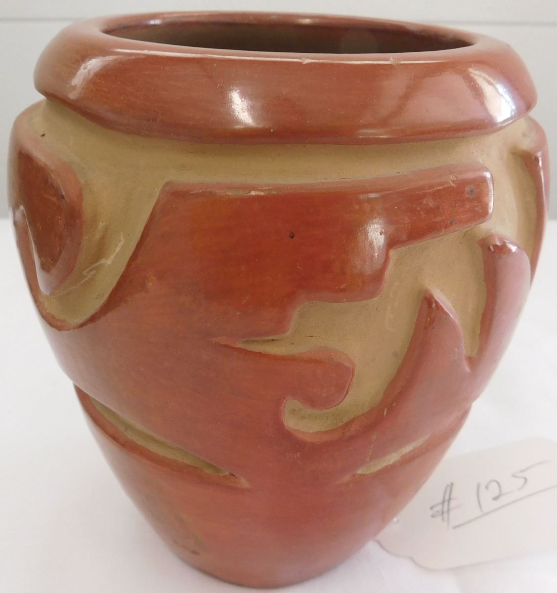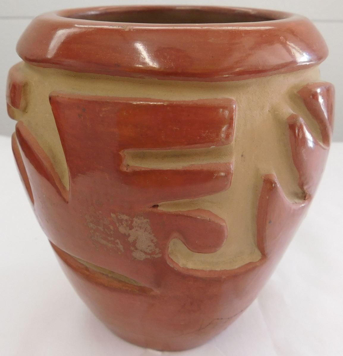 Carved Santa Clara Olla believed to be from the 1960s. Item measures 5 1/2 x 5 inches and is made from clay and paint. Condition: There is a crack on the bottom, see images. Shipping: $19.00, must be double boxed.
