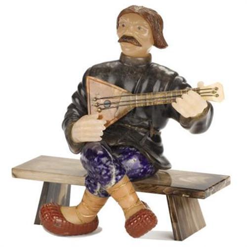 <B>Carved Semi-Precious Stone Figure of a Peasant<BR></B></I>George Wild<BR>Twentieth Century<BR>5-3/4 x 4-1/2 inches (12.1 x 11.4 cm)<BR> The figure holding a stringed instrument seated on a stone bench, composed of rose quartz, grey quartz, Swiss lapis and carnelian.<BR><BR><b>Shipping:</b> Requires 3rd Party Shipping (<a target="_blank" href="http://www.heritageauctions.com/common/shipping.php">view shipping information</a>)