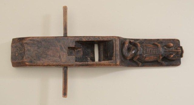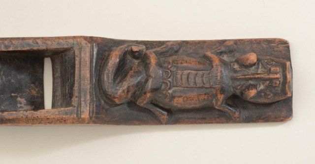 Carved Sepic or New Guinea region fire starter with crocodile, 16” across; primitive chip or adz carving; age unknown; from an estate. Est.: $150-$300.