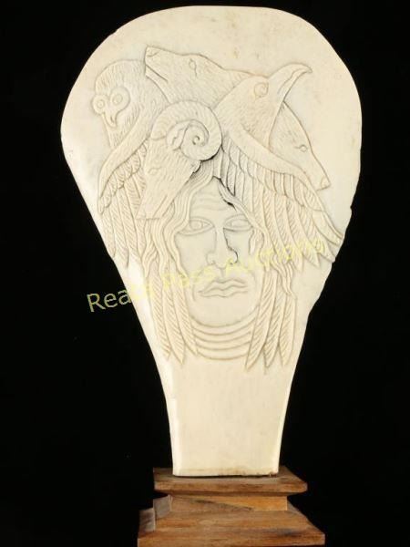 Hand crafted from the shoulder bone of a moose by Richard Green for Alaska Creations. Carving of a Native American man's face surrounded by a raven, ram, bear and owl. Measures10 3/4"h x 6"w x 2 3/4"d on square wood base. A unique piece of Alaskan art.