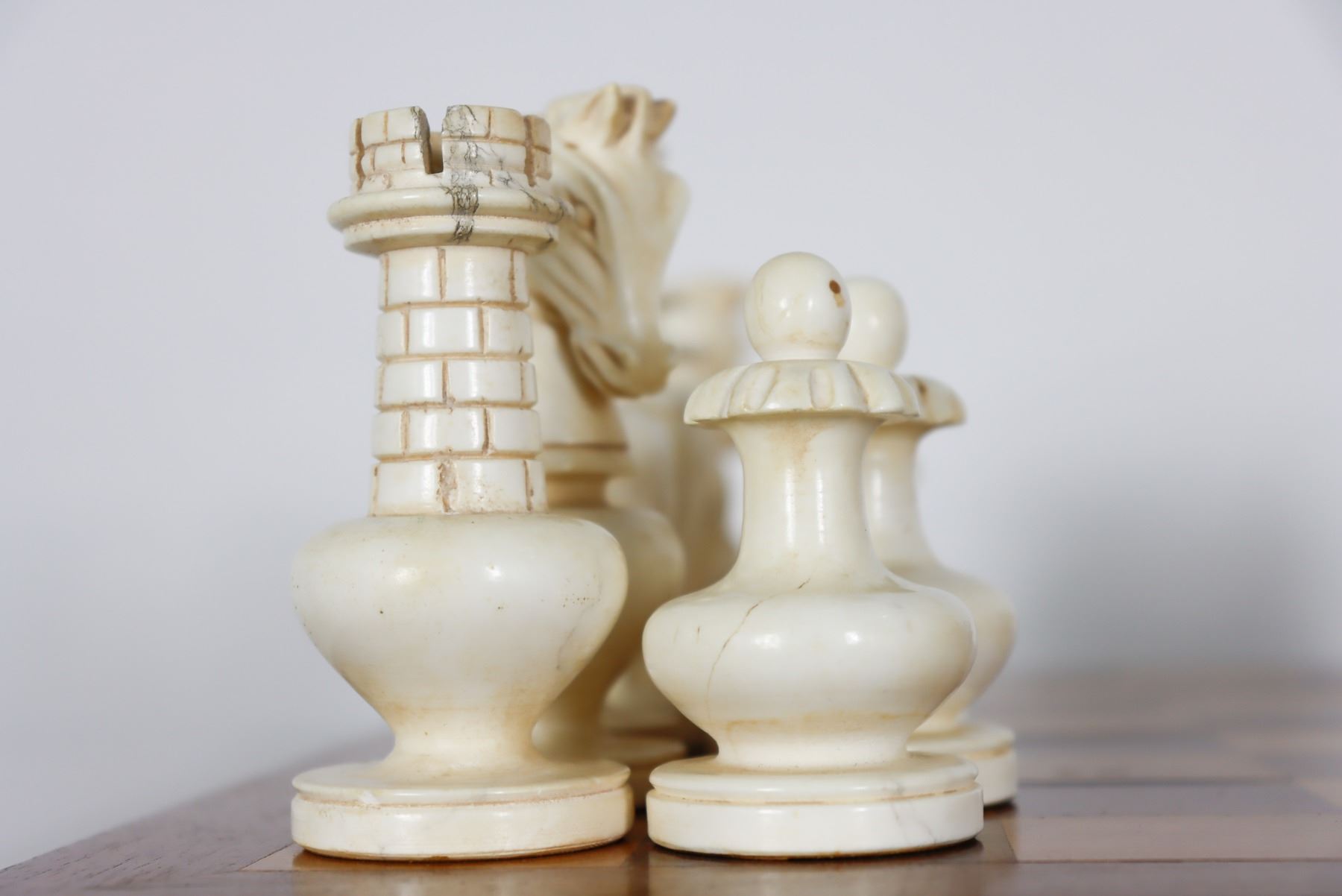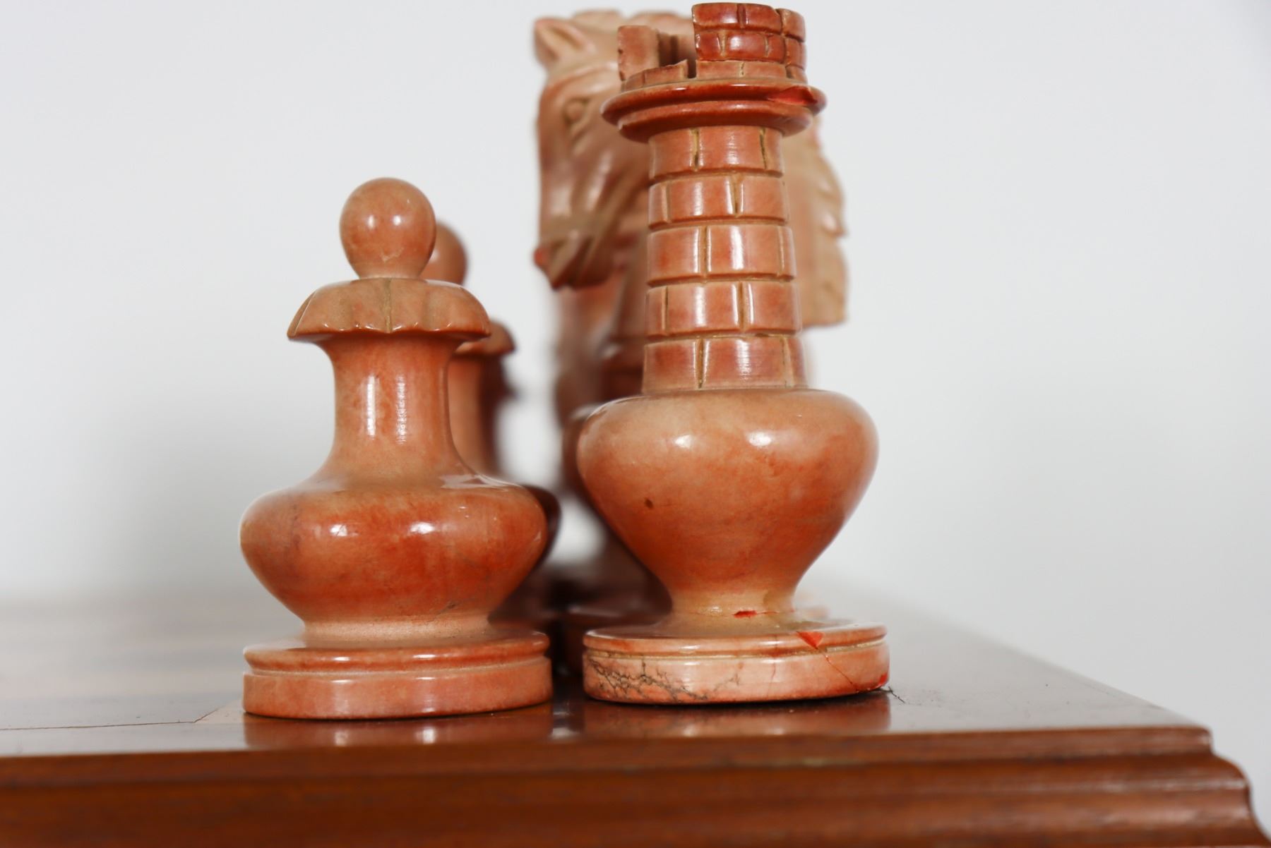 Carved stone chess set, contains board and pieces. Off white stone and amber color.