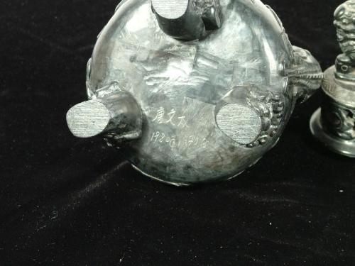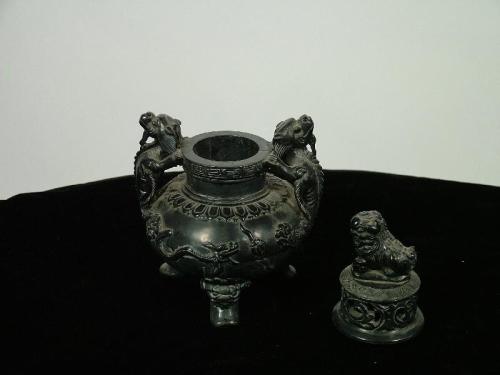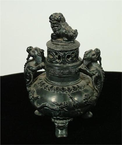 (China Late 19th Century) Carved black stone with Fire Pit Face feet, Dragon motif handles, and Shizi dog top, mark verso, 8" by 5 1/2".