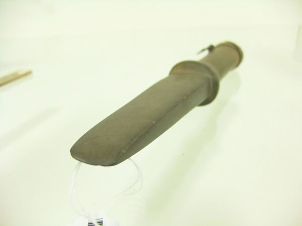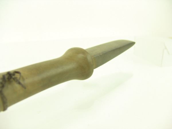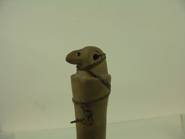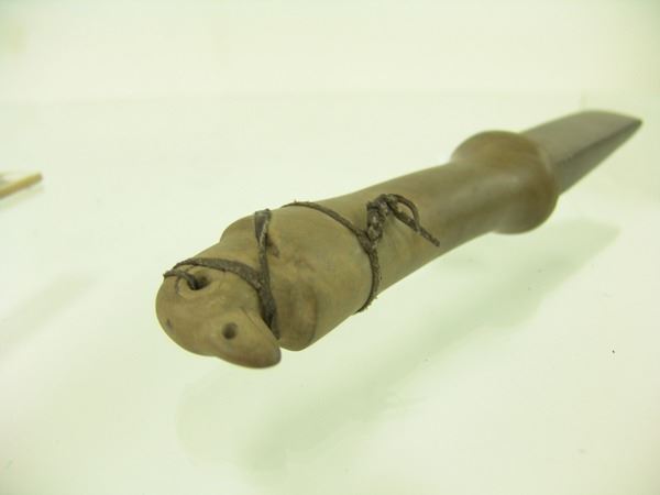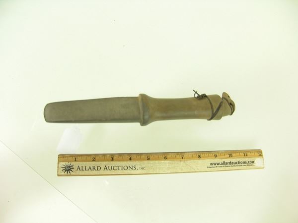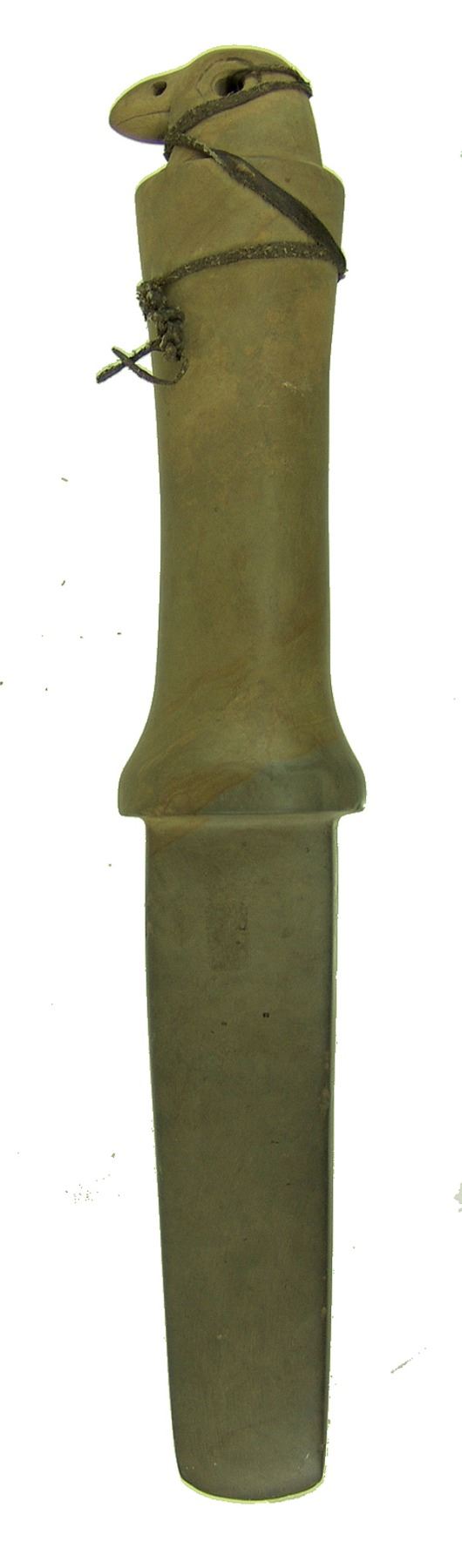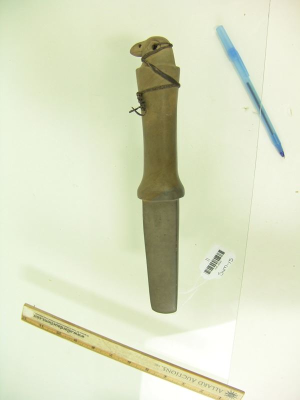 Beautiful hand carved stone tool with shaped handle and squared blade, the top with a bird head effigy. Very good condition. Looks old, but probably a newer piece.Mid/Late 1900s11"