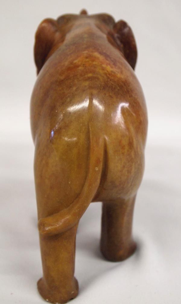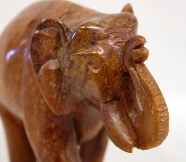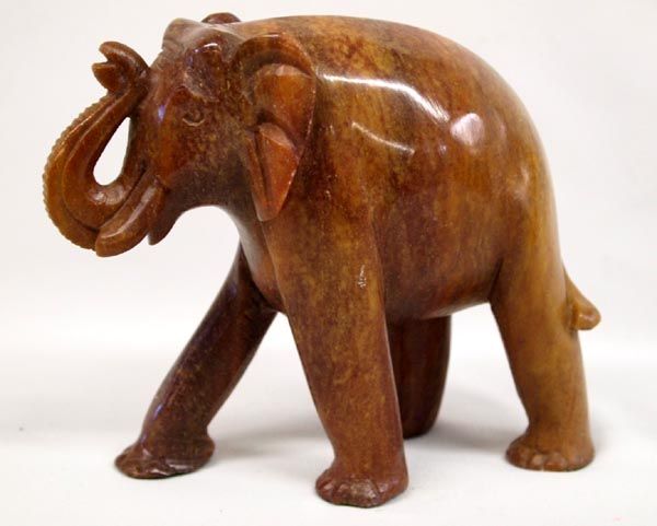 Carved Stone Elephant. Measures approx. 5''H x 6''L x 2 1/2''W. Has a very small chip out of the top of one ear. Very heavy.