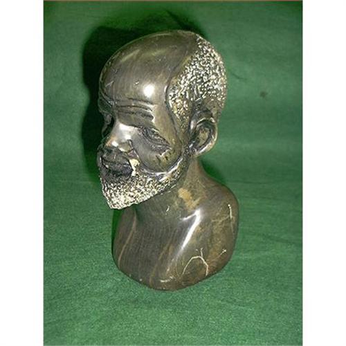 This is a well carved piece of stone. What type of stone?, I can't tell. But the time to carve this must have been overwhelming. It's in excellent condition. It measures 7 1/4" tall by 3 1/2" wide by 3 1/2" deep. Would look great with any collection you have. CARVED BLACK MAN AND DONE VERY NICELY. EVEN SHOWS SOME GREY HAIR, REALLY UNIQUE AND NICELY DONE. A VERY HARD TO FIND AND GET ITEM.