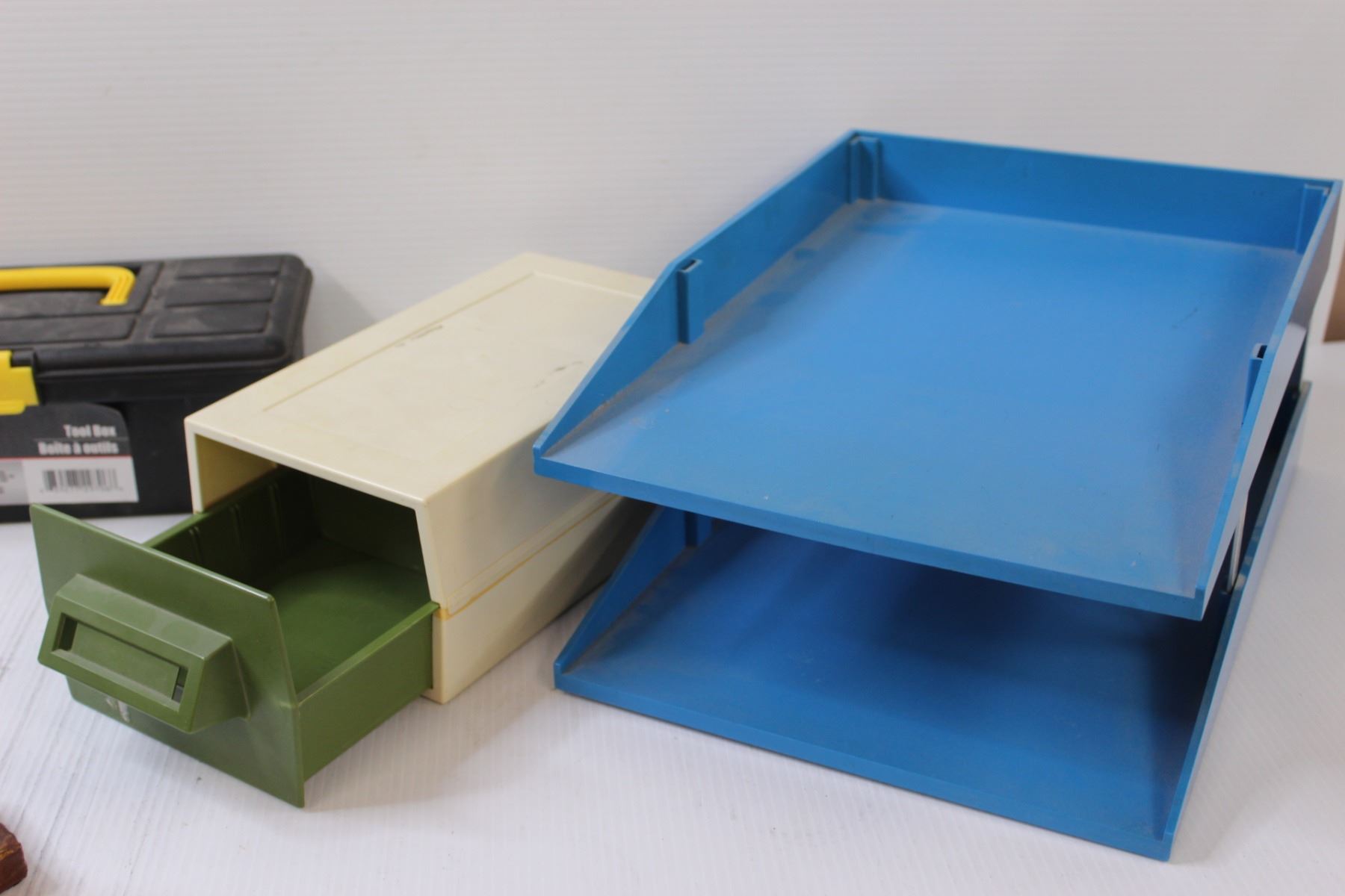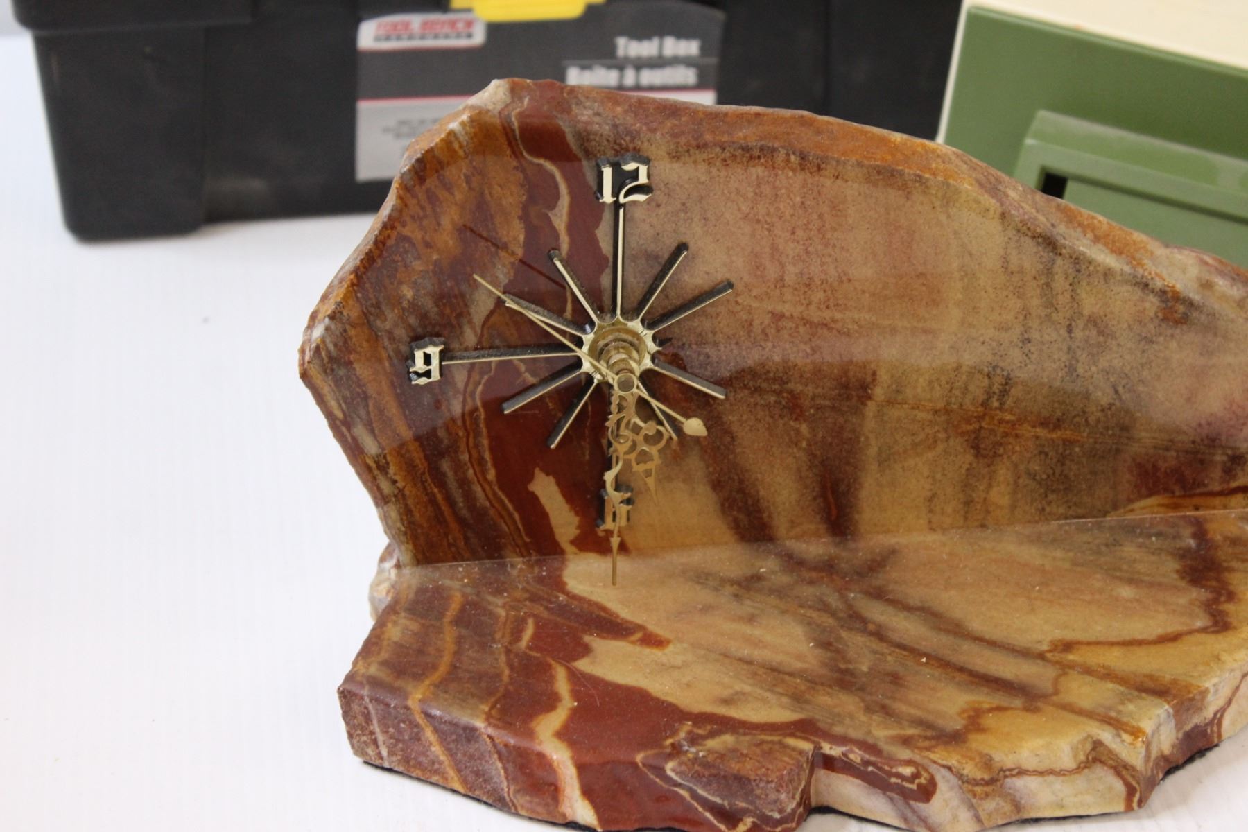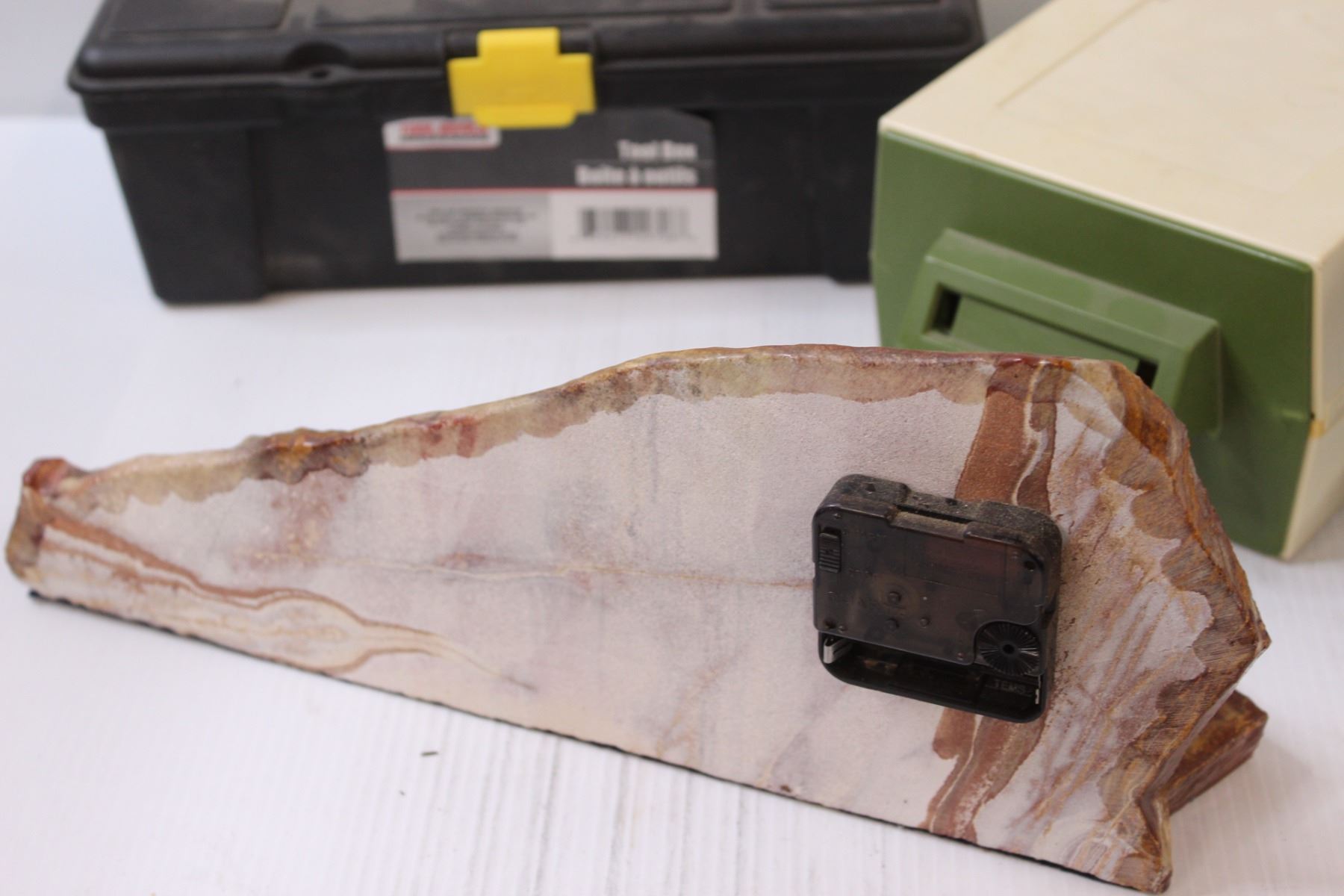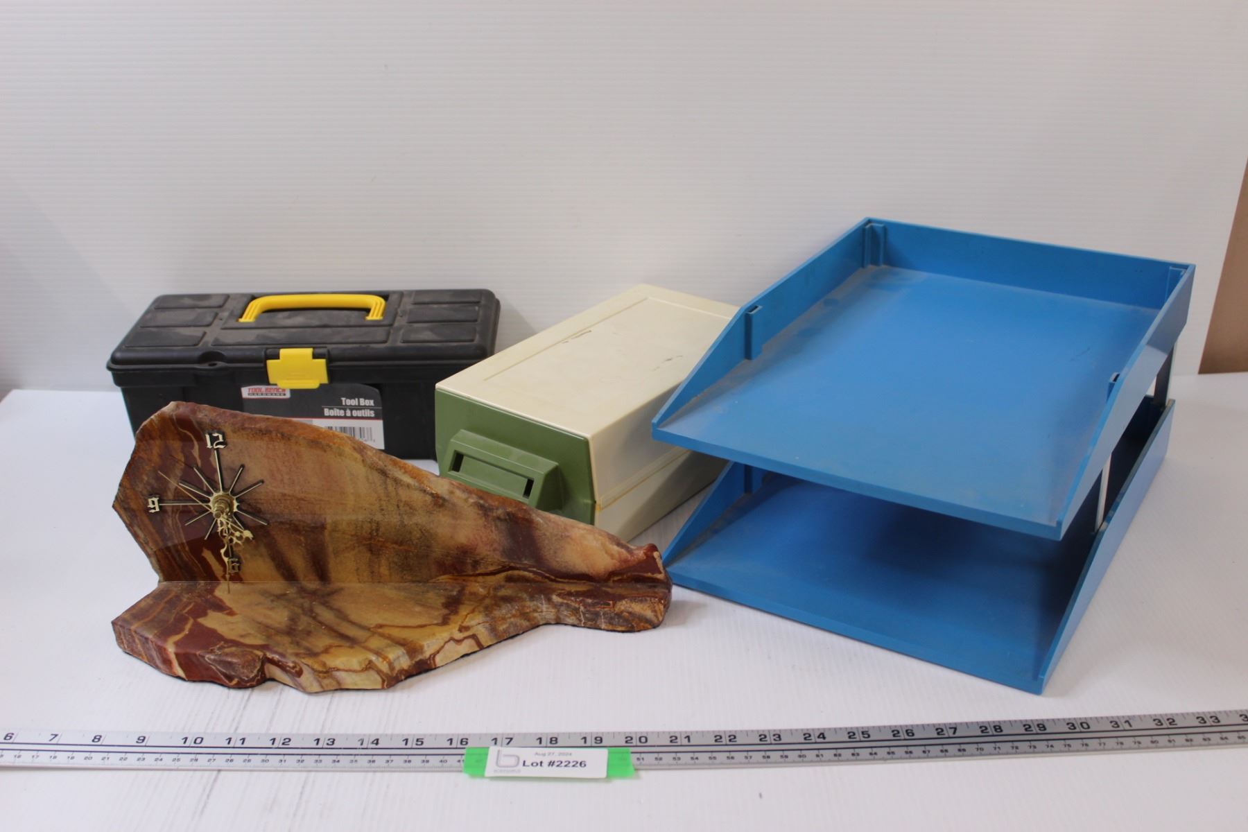 Carved Stone Mantle Battery Operated Clock, (2) Office Organizers, Tool Box