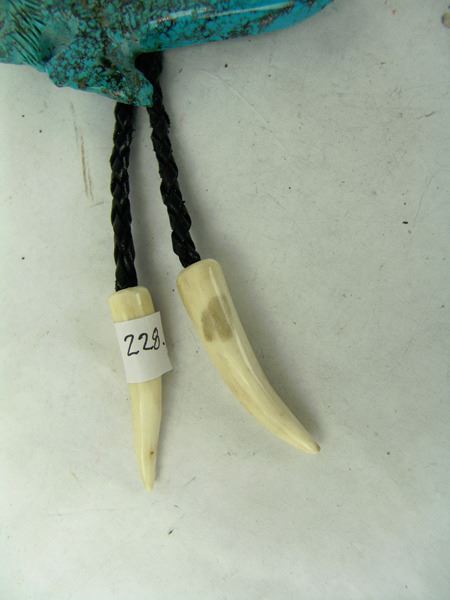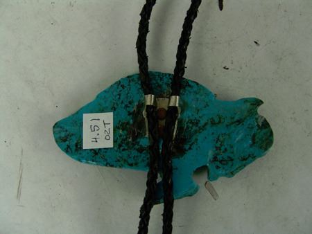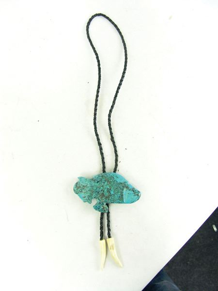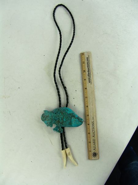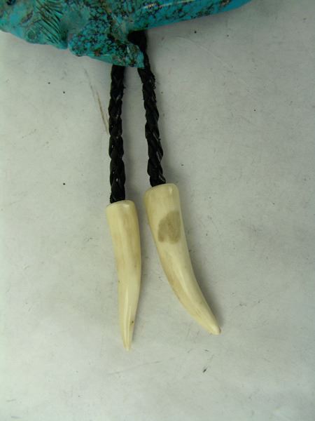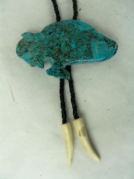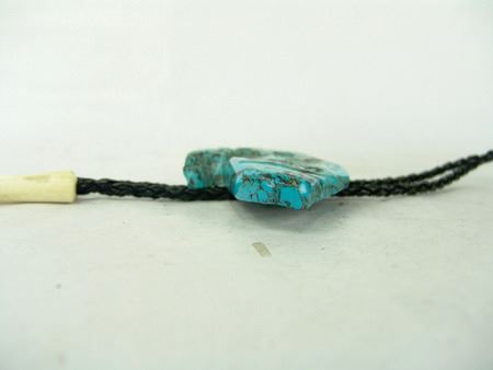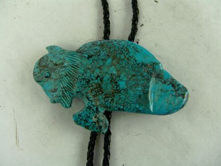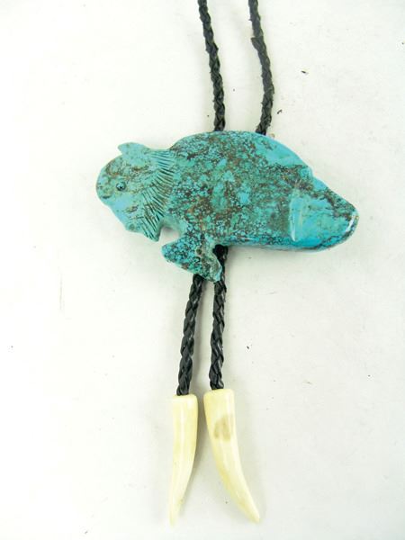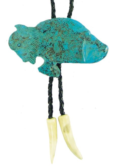 Ca. 1992, Wonderful hand carved solid turquoise (4.5ozt) sculpture of a buffalo that has been turned into a bolo slide, and with carved bone tips. Very good condition. 41" long, bolo 3" x 5"
