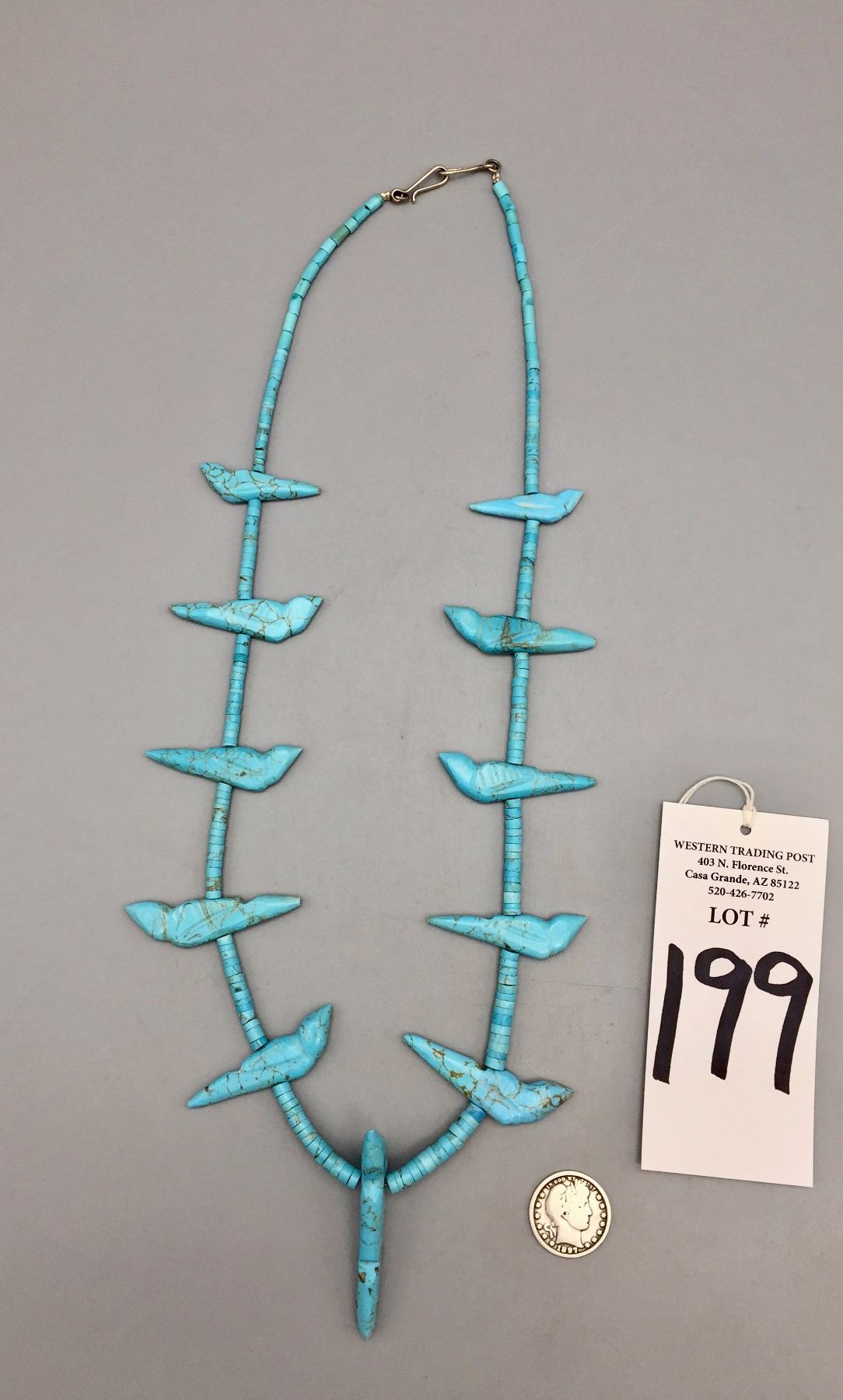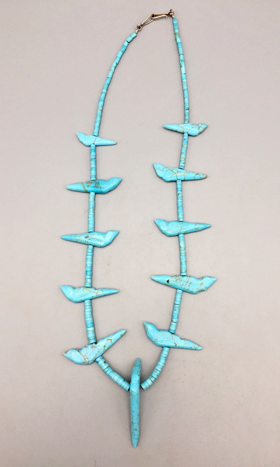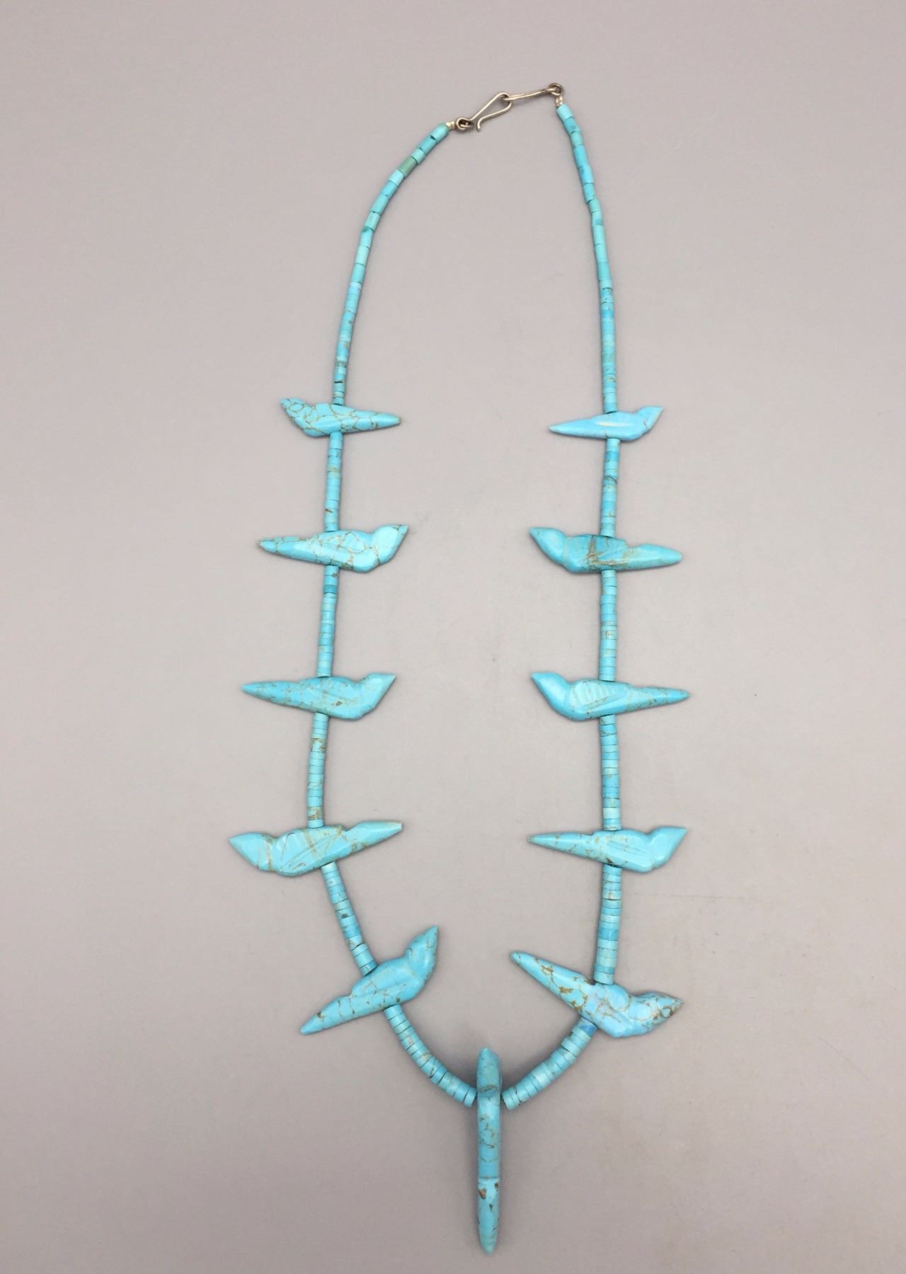 Description: Carved turquoise necklace. Maker: Unknown, Pueblo in style. Approx. Age: Vintage. Size: 26” around the neck. Condition: Good for its age, normal wear expected. Please look closely at the pictures - they are an important part of our description. Shipping: There will be a $5 handling / packaging fee for shipping this lot. The actual cost of postage will be added on top of that.