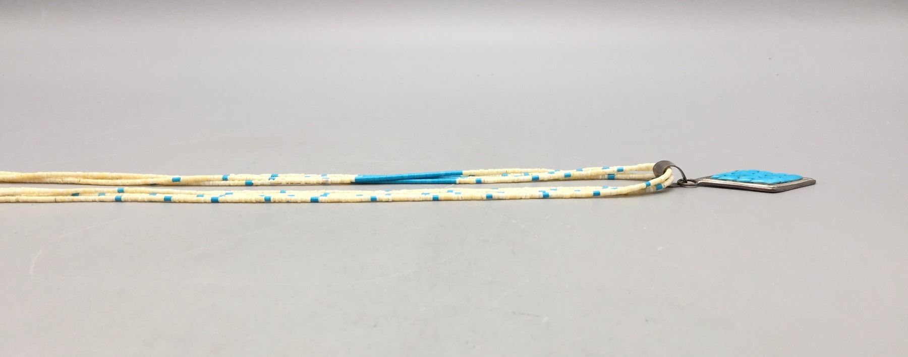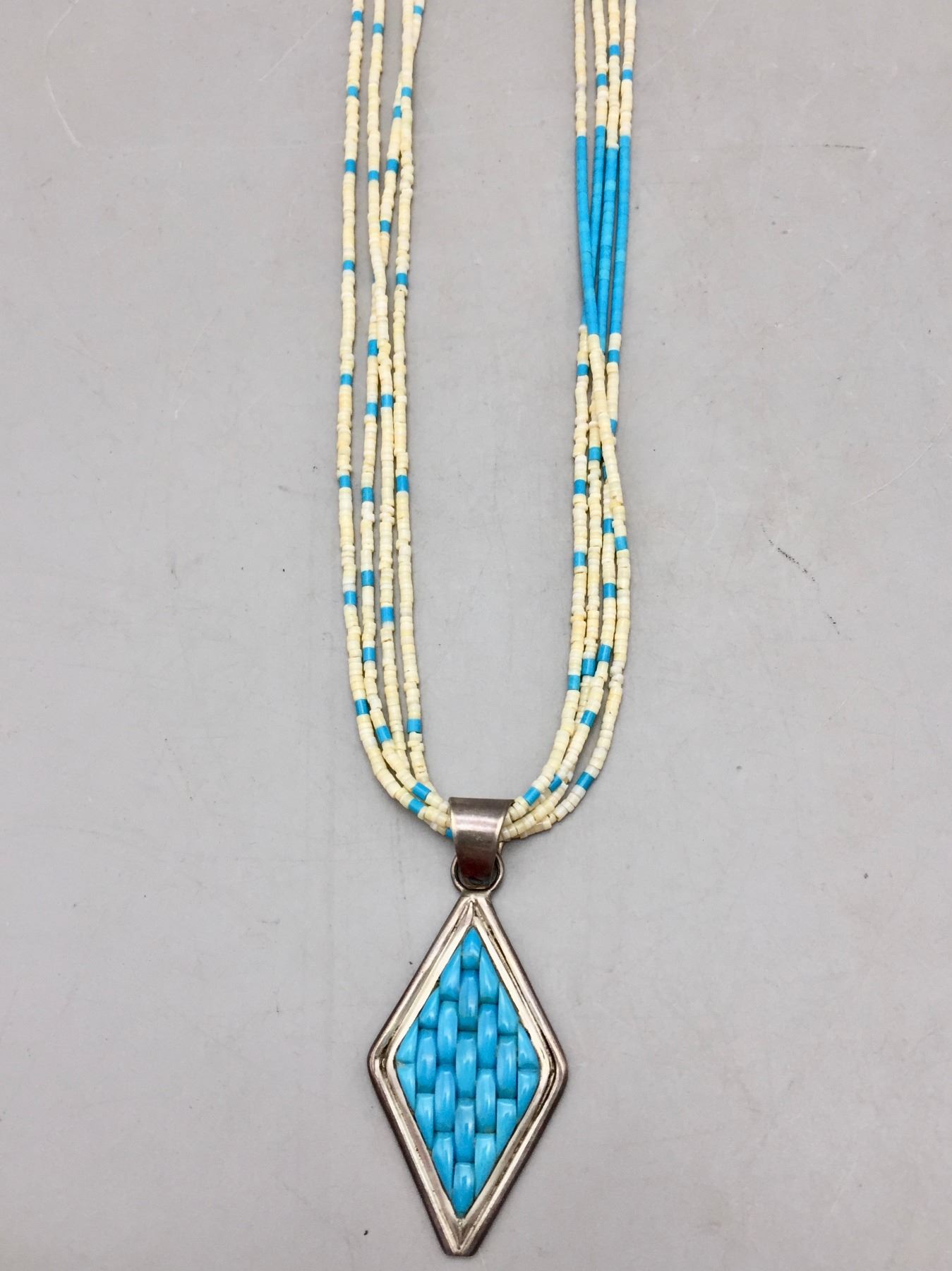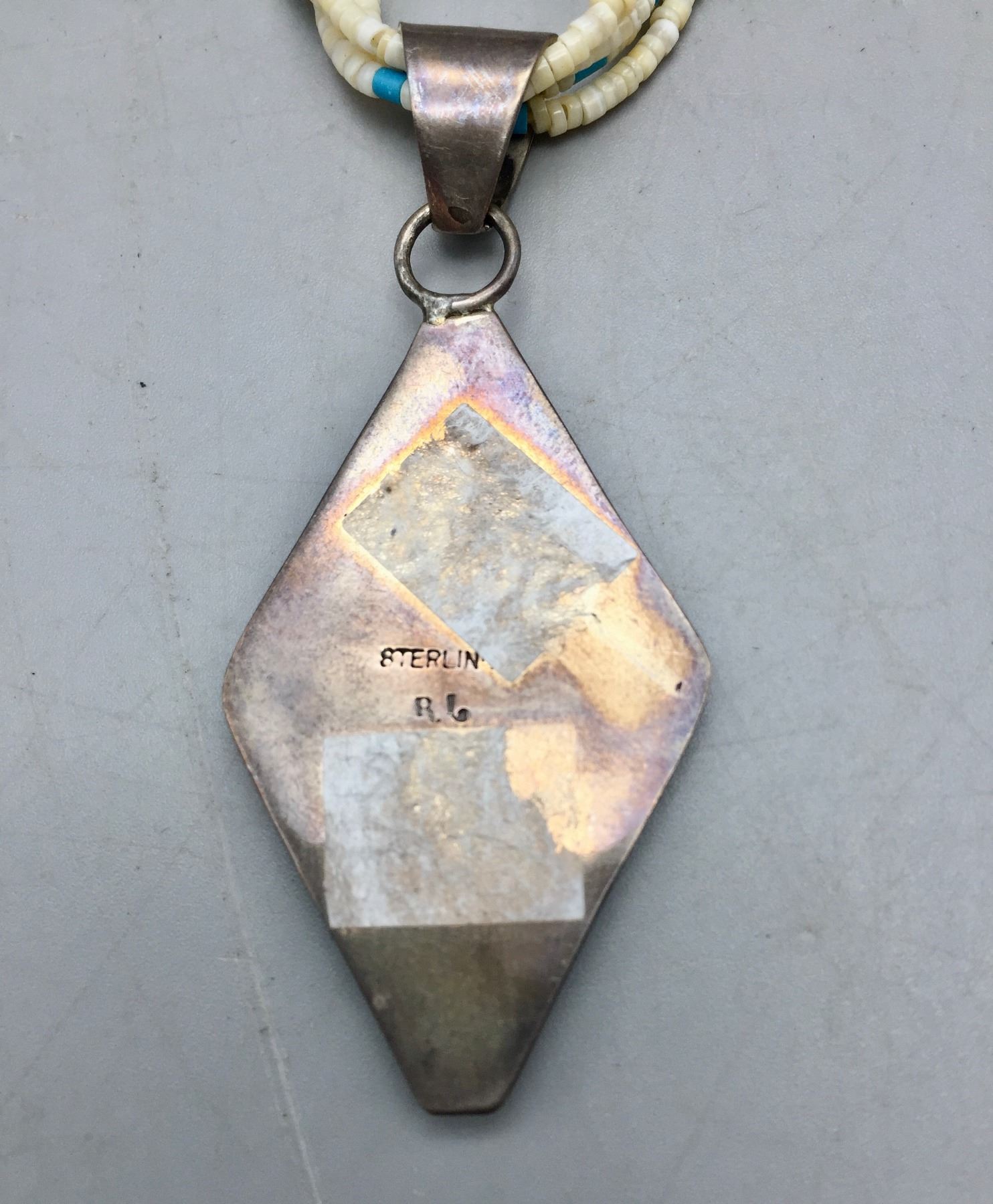 Description: A nice, 4-strand, shell and Turquoise necklace with pendent. The pendent is carved turquoise and is stamped as sterling silver and has the artist's hallmark. Maker: Hallmarked, RL (maybe the hallmark of Ray Lovato, Santo Domingo). Approx. Age: Fairly contemporary. Size: The necklace fits approx. 24 inches around the neck plus the Pendant is an additional 1" wide x 2" long. Weighs 26.2 g. Condition: Good for its age, normal wear expected. Please look closely at the pictures - they are an important part of our description. Shipping: There will be a $5 handling / packaging fee for shipping this lot. The actual cost of postage will be added on top of that.
