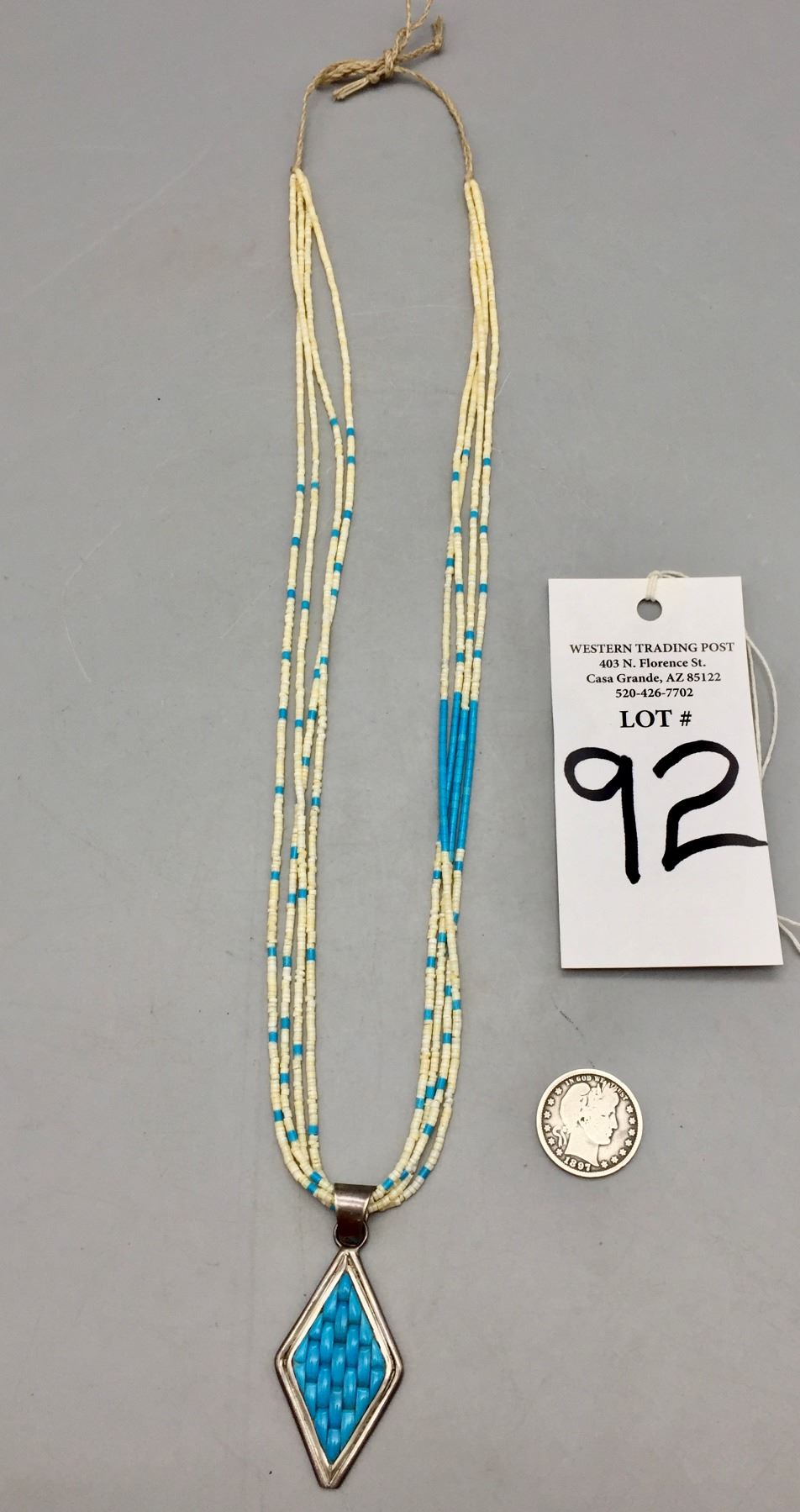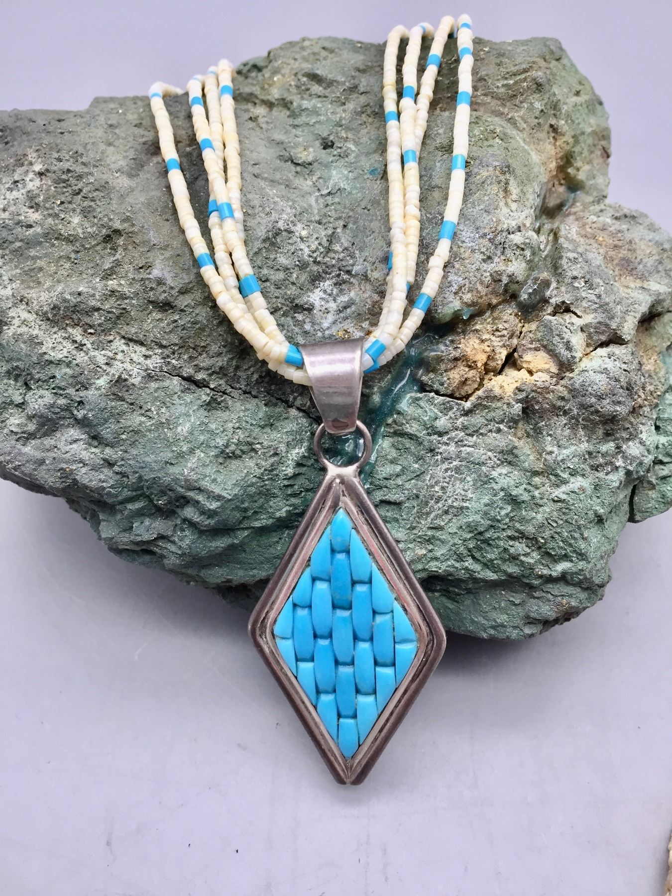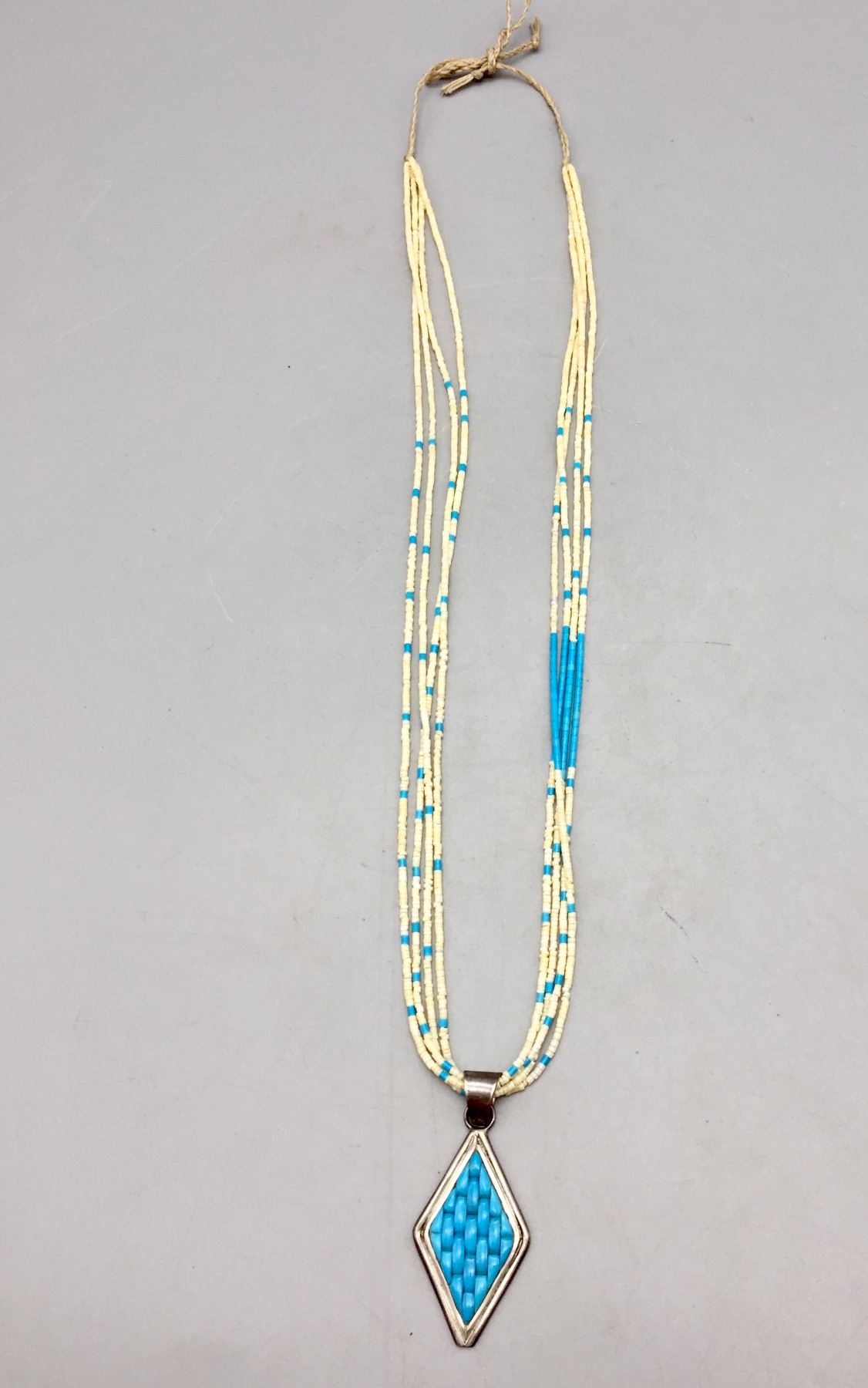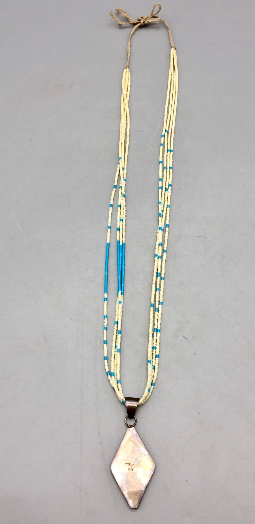 Description: A nice, 4-strand, shell and Turquoise necklace with pendent. The pendent is carved turquoise and is stamped as sterling silver and has the artist's hallmark. Maker: Hallmarked, RL (maybe the hallmark of Ray Lovato, Santo Domingo). Approx. Age: Fairly contemporary. Size: The necklace fits approx. 24 inches around the neck plus the Pendant is an additional 1" wide x 2" long. Weighs 26.2 g. Condition: Good for its age, normal wear expected. Please look closely at the pictures - they are an important part of our description. Shipping: There will be a $5 handling / packaging fee for shipping this lot. The actual cost of postage will be added on top of that.