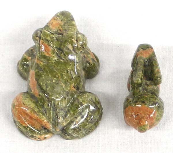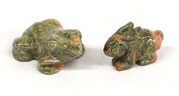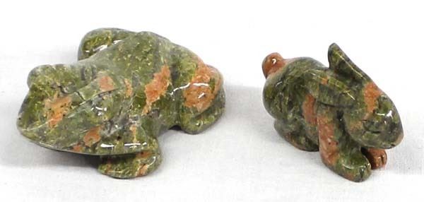 Carved Unikite Stone Frog and Rabbit Fetishes, frog is 2''L and rabbit is 1.5''L, stunning colors