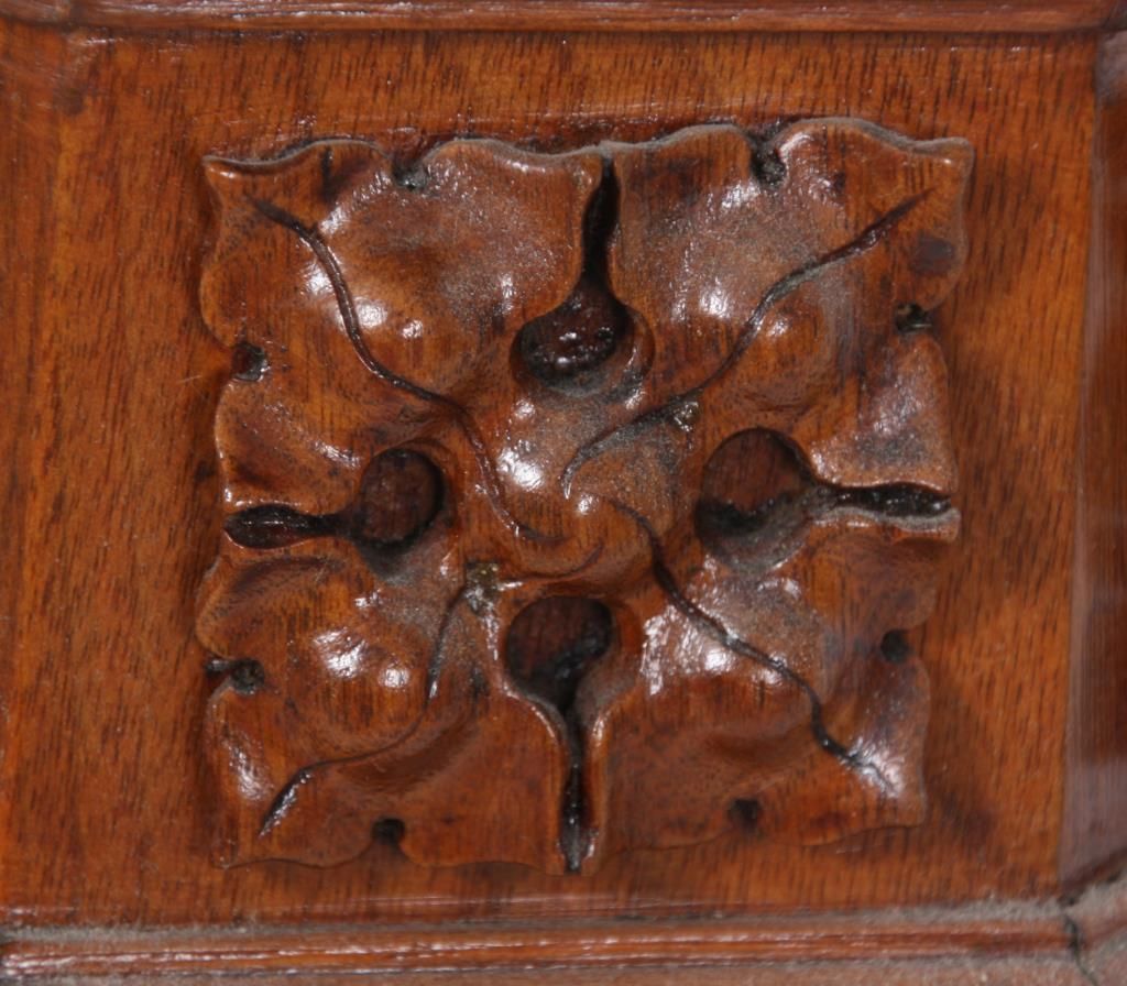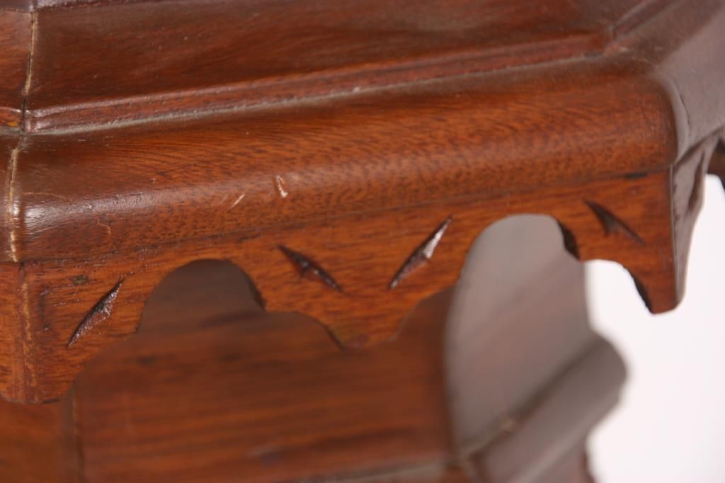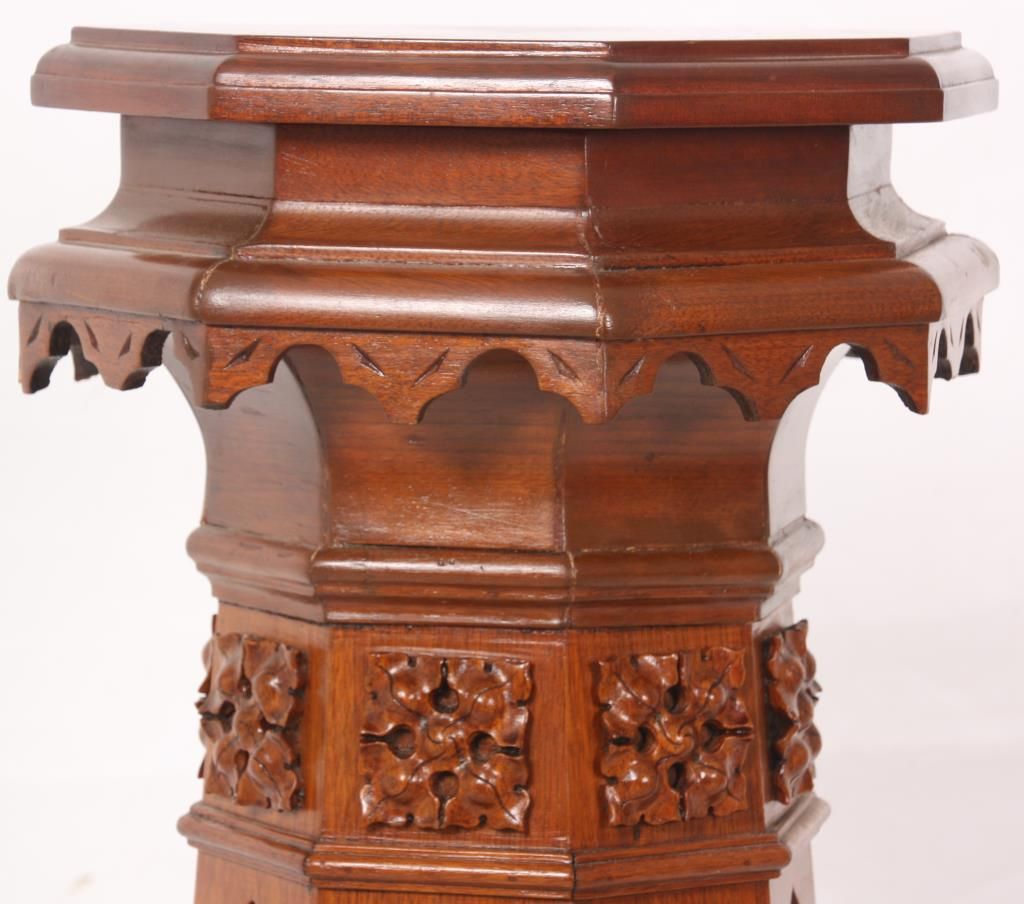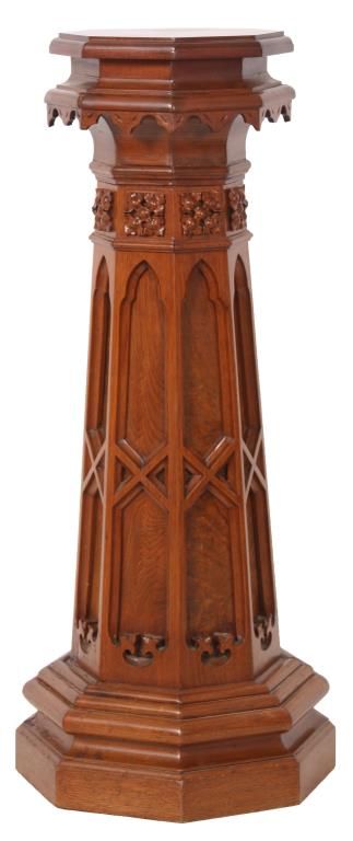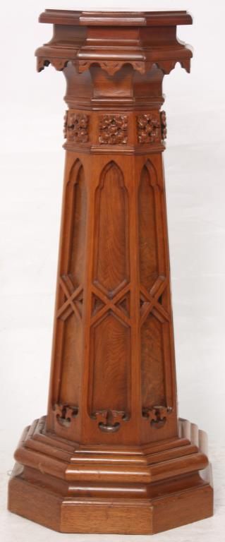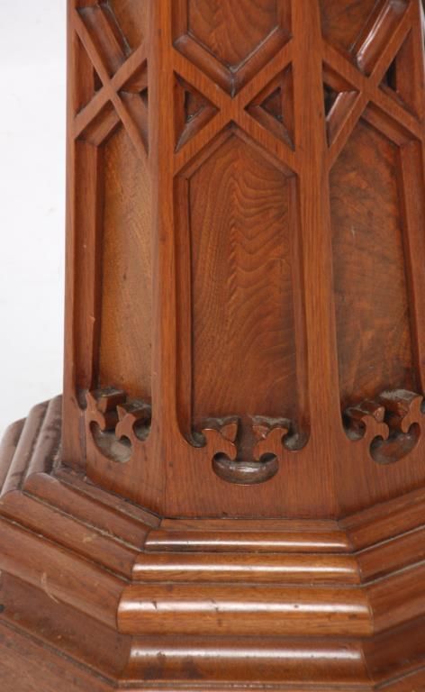 Carved Walnut Gothic Pedestal. 11 in. octagonal top with a leaf carved apron, reverse tapered octagonal column has a band of leaf carved rosettes over long inset gothic arched panels. Replaced top, good overall condition. 37 in. high x 14 in. dia. at the base.