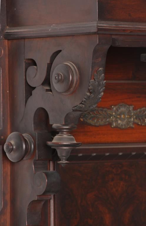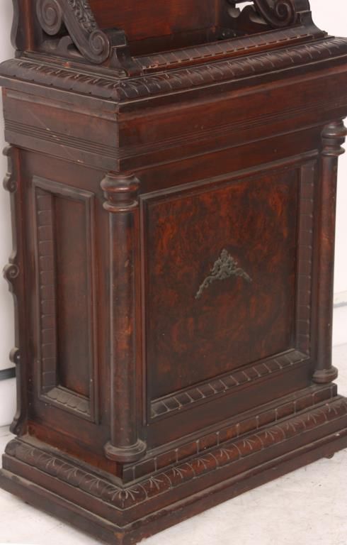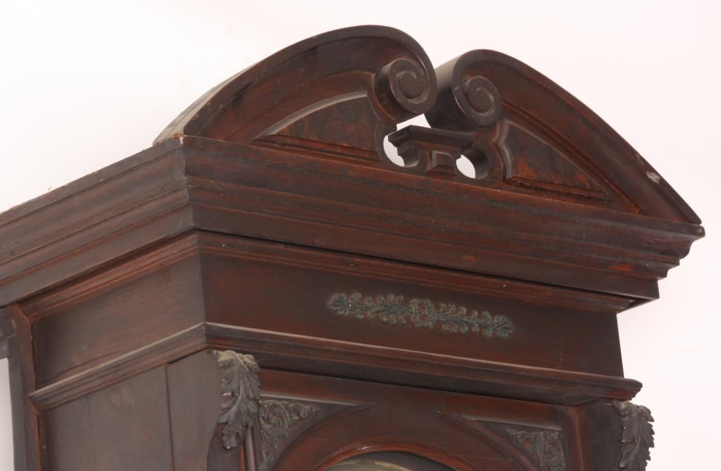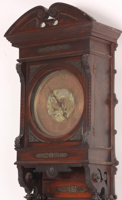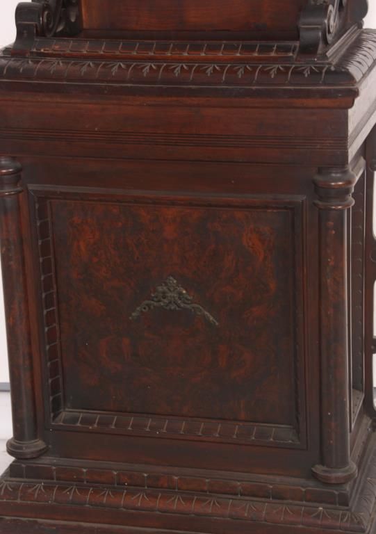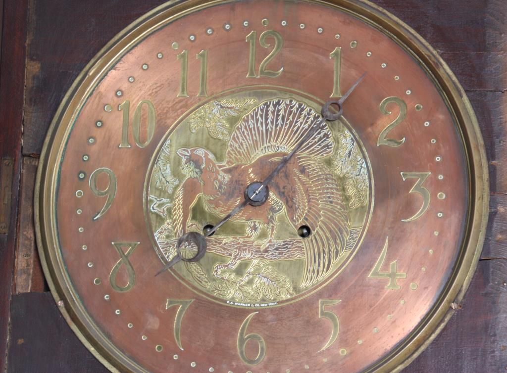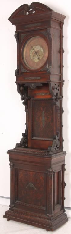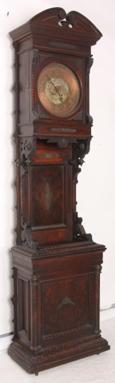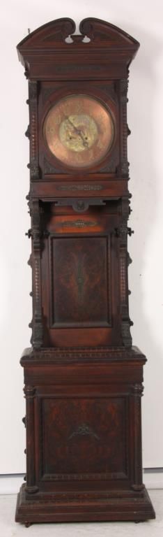 Carved Walnut Standing Floor Regulator. 14 in. bronze dial has a two tone gold and copper colored finish with hour numbers, engraved scenic center with fanned grouse perched on a branch, has open moon hands and dial signed “C.A. Warner & Co. New York”; brass 8 day spring driven movement is singed F. Kroeber, has a half hour countwheel strike on a coiled gong. In a floor standing American carved walnut case with scrolling broken arched crest with raised burled panels, filigree carved corbels on the door front with round dial glass, open mid-section with inset burled panel with turned teardrop finials and turned rosettes; the base has turned corner columns and a burled inset center panel. In good overall condition and original finish. 95 in. high x 24 in. wide x 13 in. deep.
