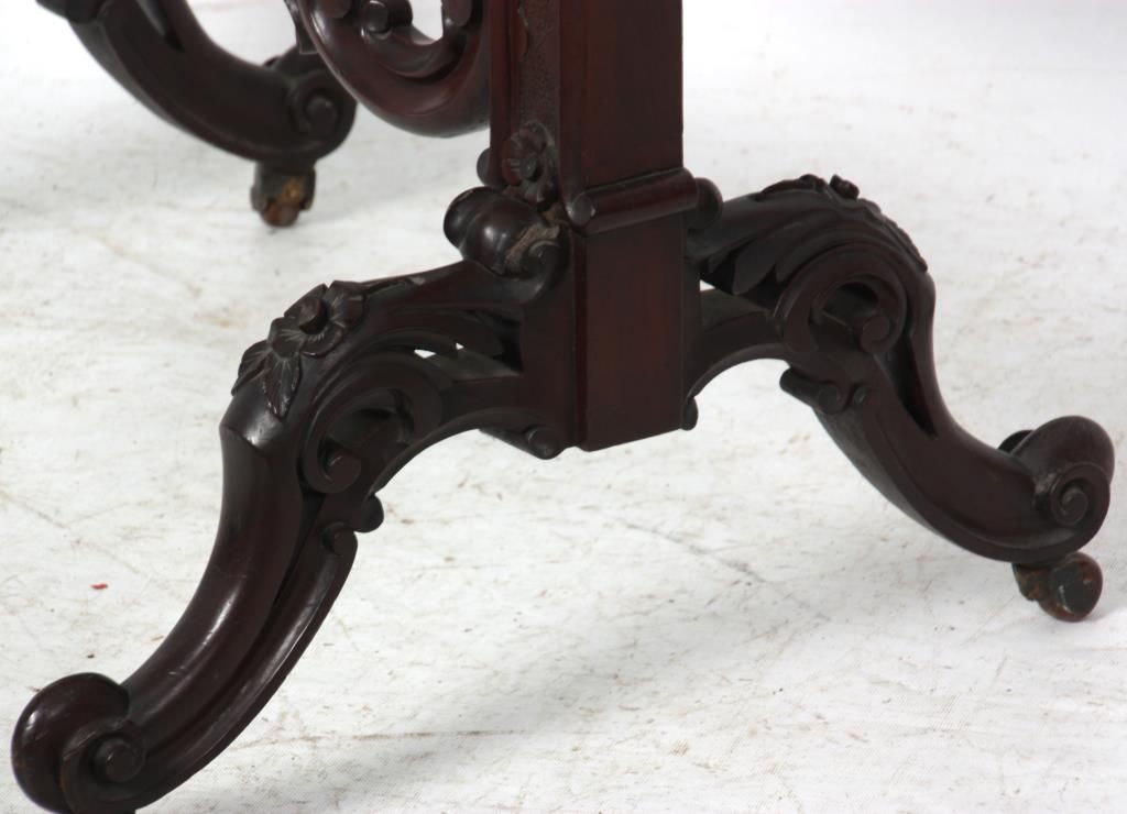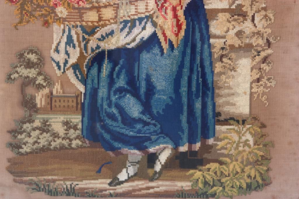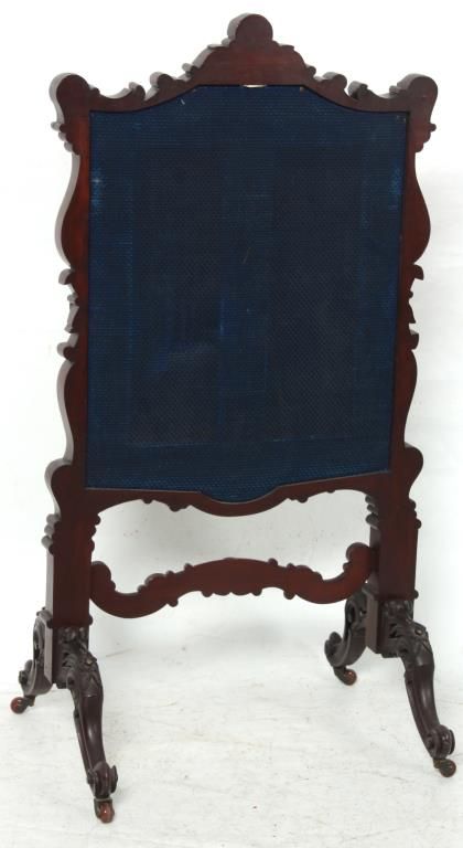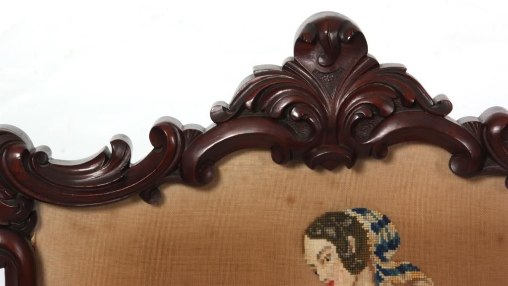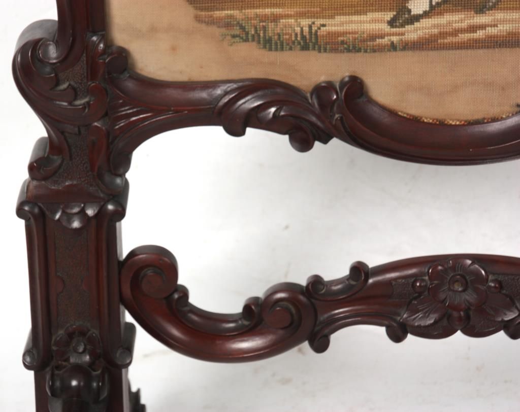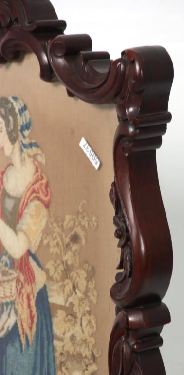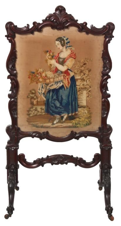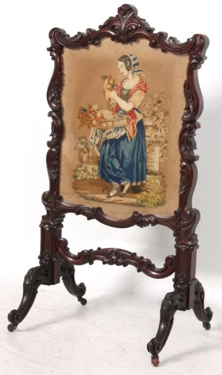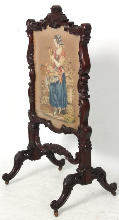 Carved Walnut Tapestry Fire Screen. The heavily carved frame has an elegant flowing design with scattered flowers, stands on 4 serpentine legs with flowers at the knee, scrolled feet and carved center stretcher; the center tapestry panel depicts a scene of a woman sorting through a basket of flowers with a view of an estate in the background. In very good condition and original finish. 47.5 in. high x 24.5 in. wide x 21 in. deep.