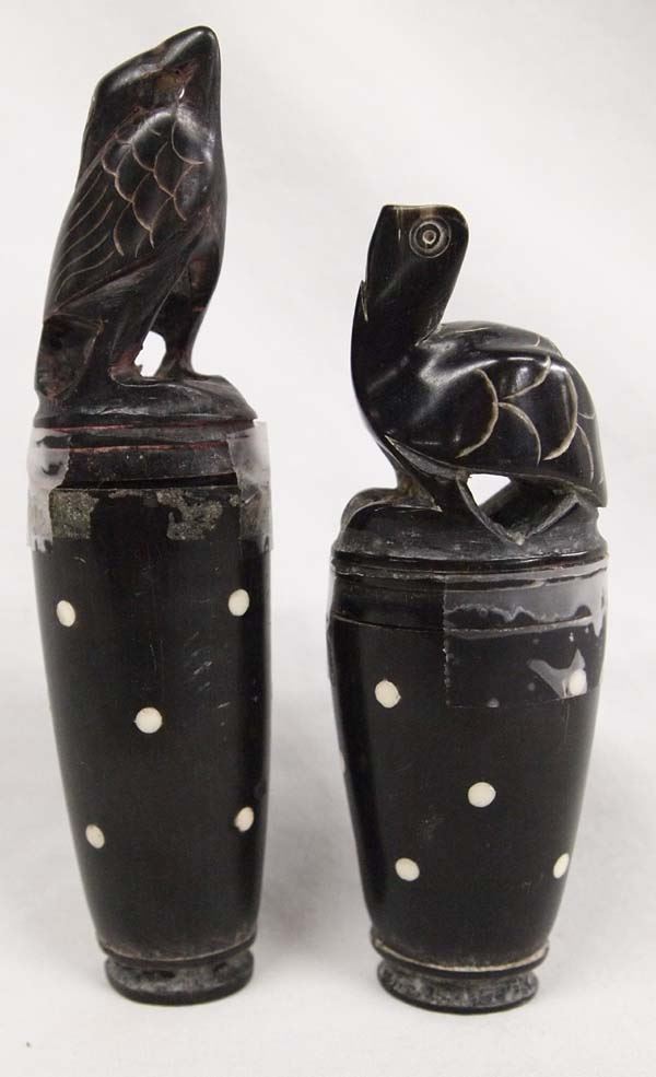 Fabulous Carved Water Buffalo Horn Herb Containers, inlay with white bone accents, turtle box is 4.75''T and the bird box is 5.75''T, from the Lombok Island, Indonesia