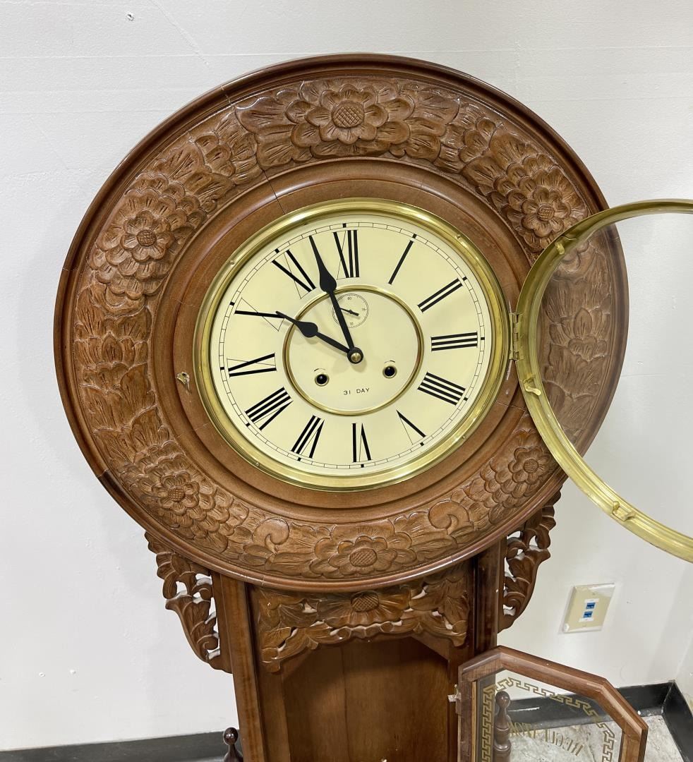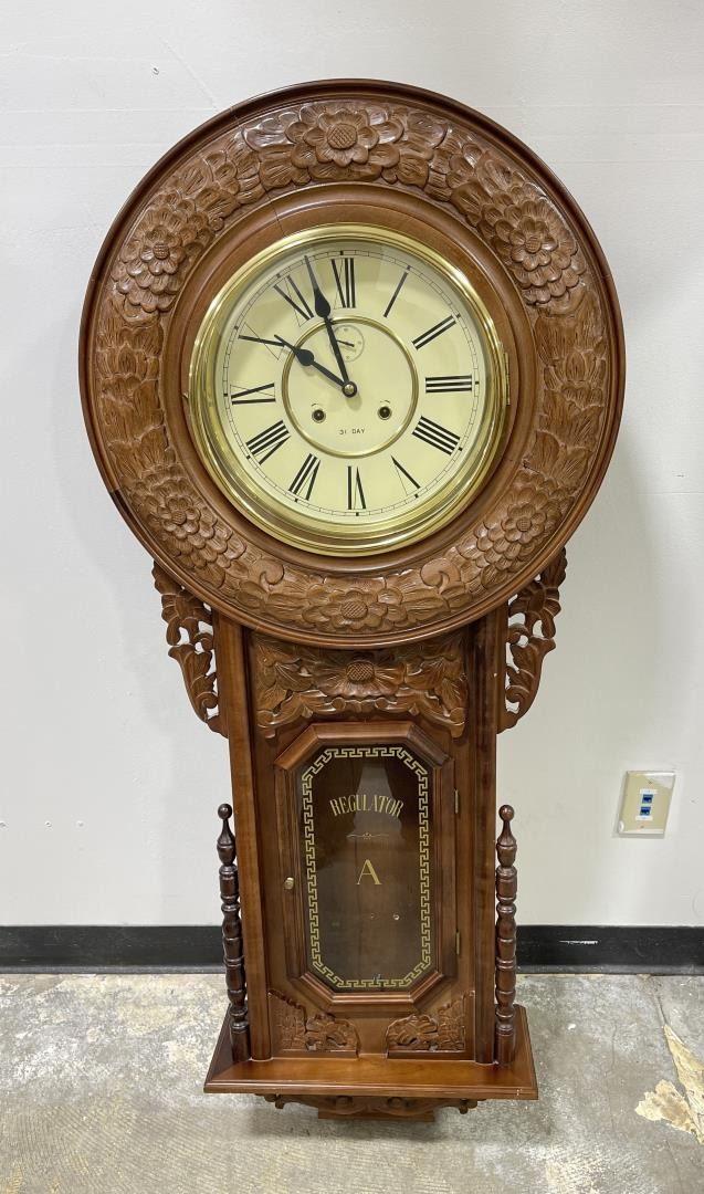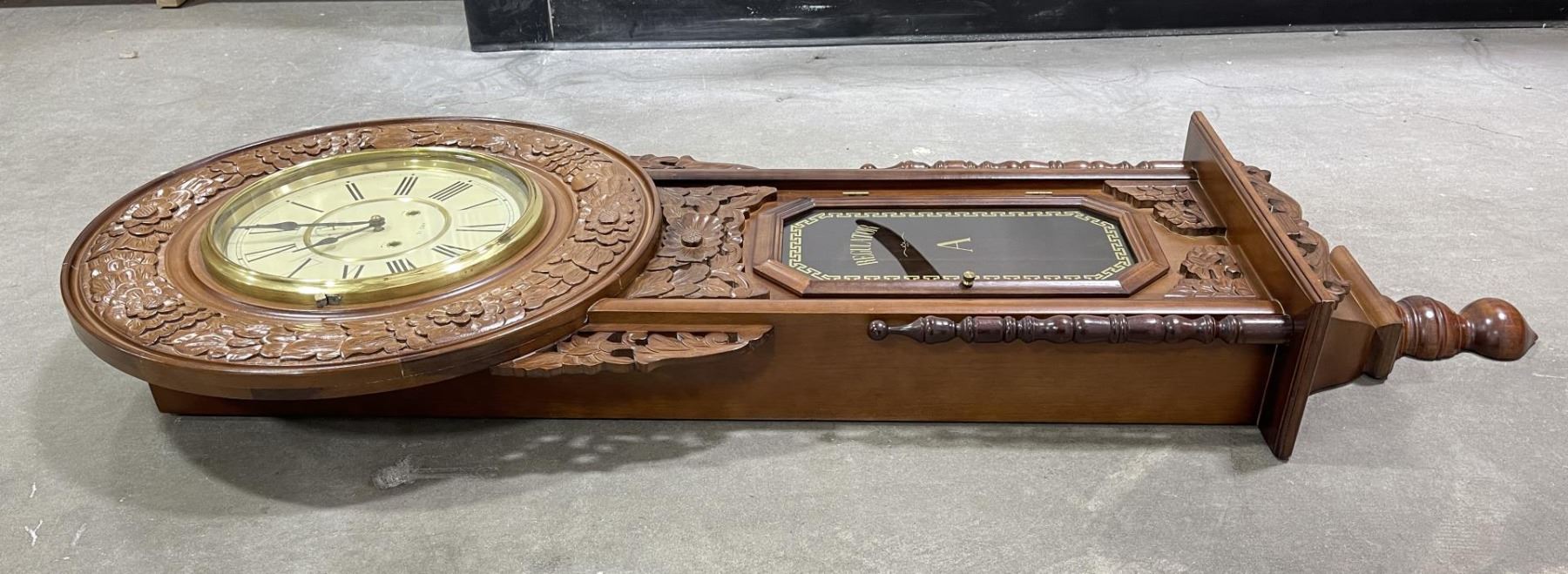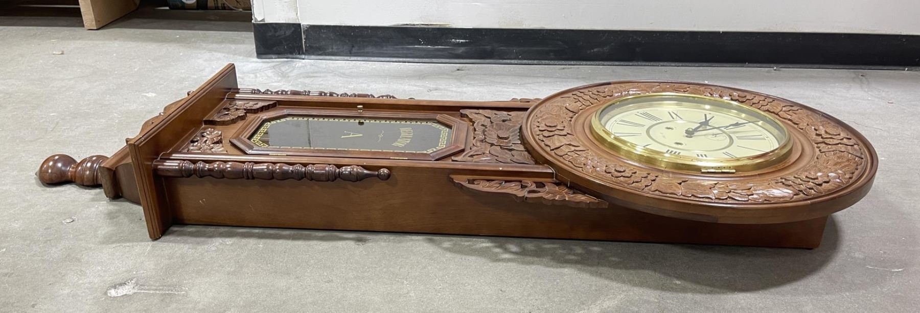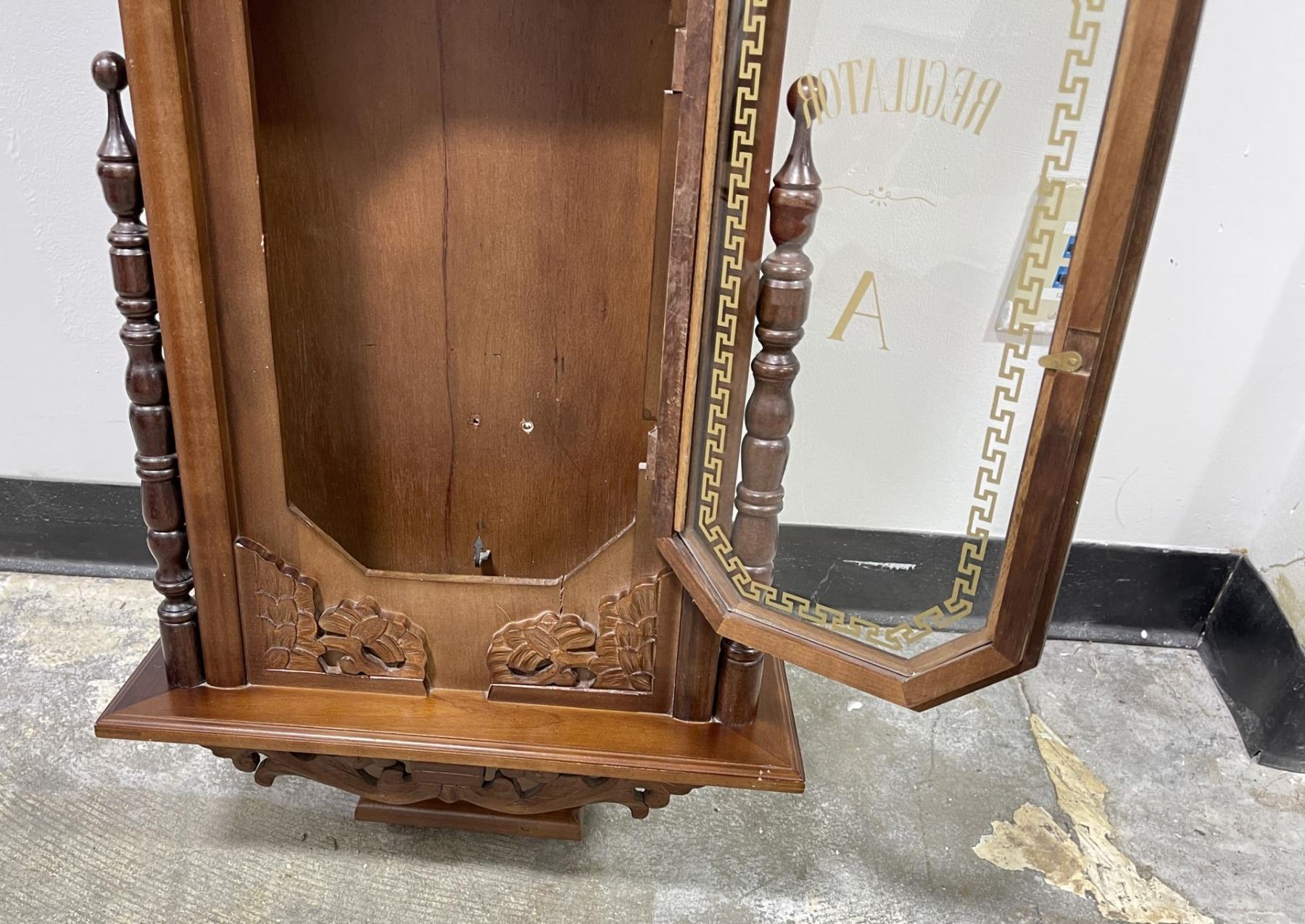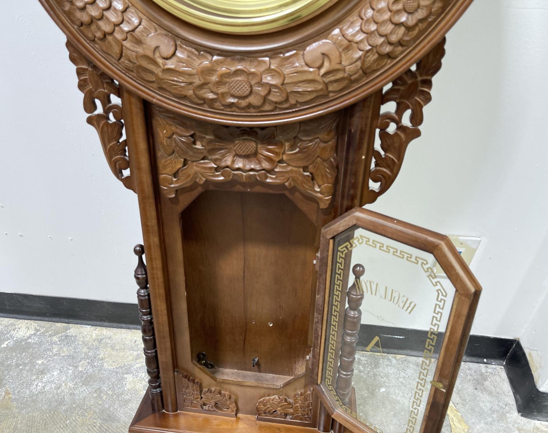 Will be very expensive to ship. Has pendant as shown. Front latch broken. Large clock. 52" tall. Will be very expensive to ship.