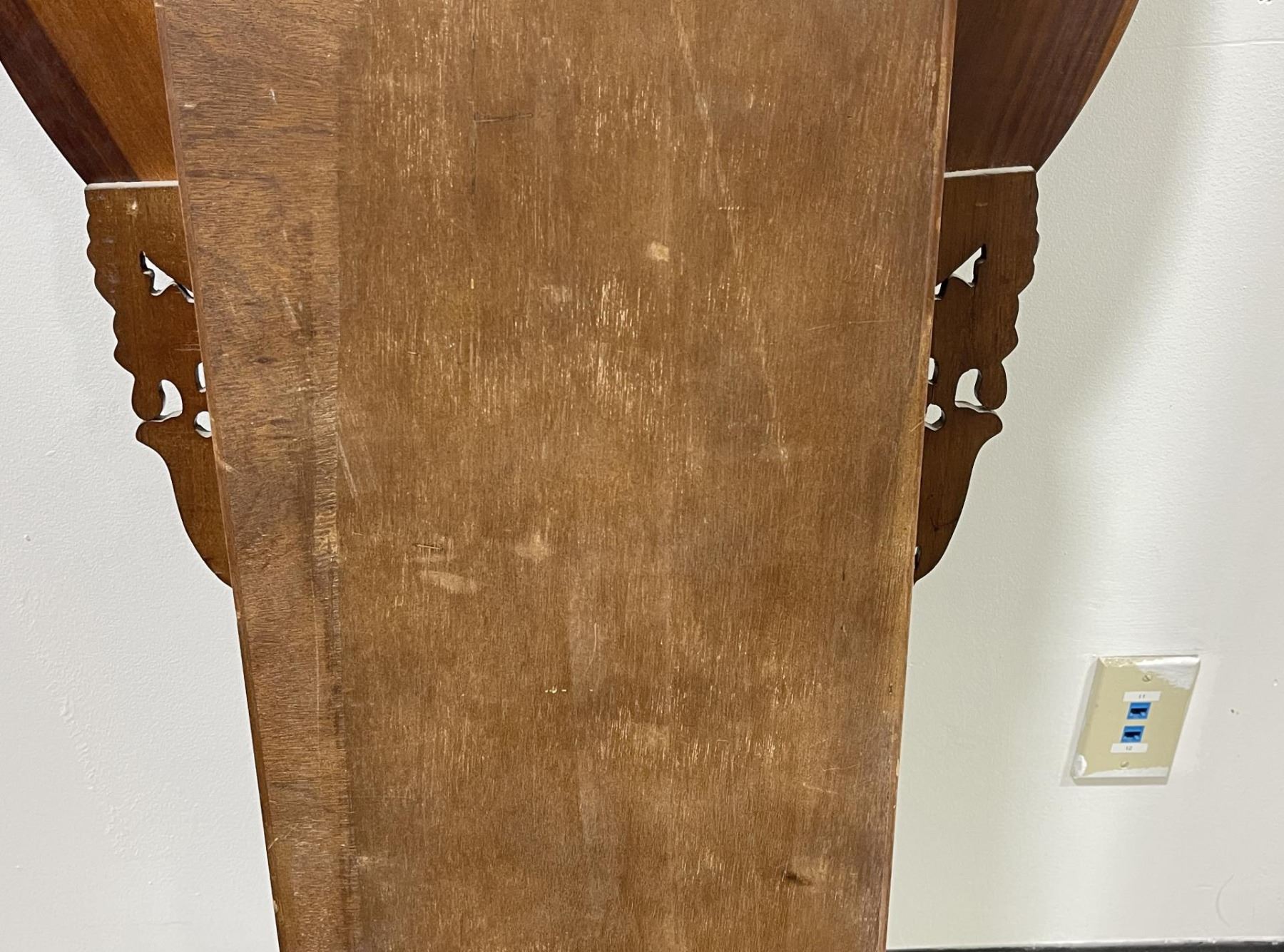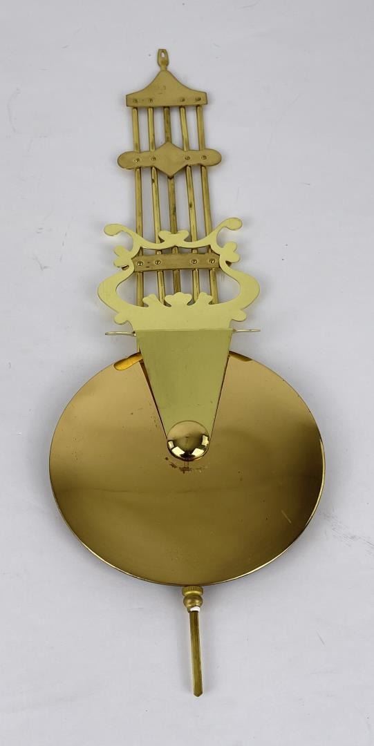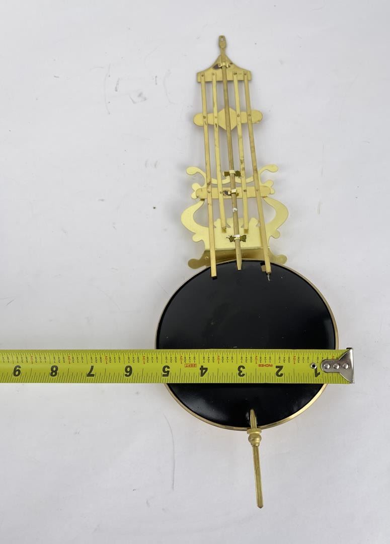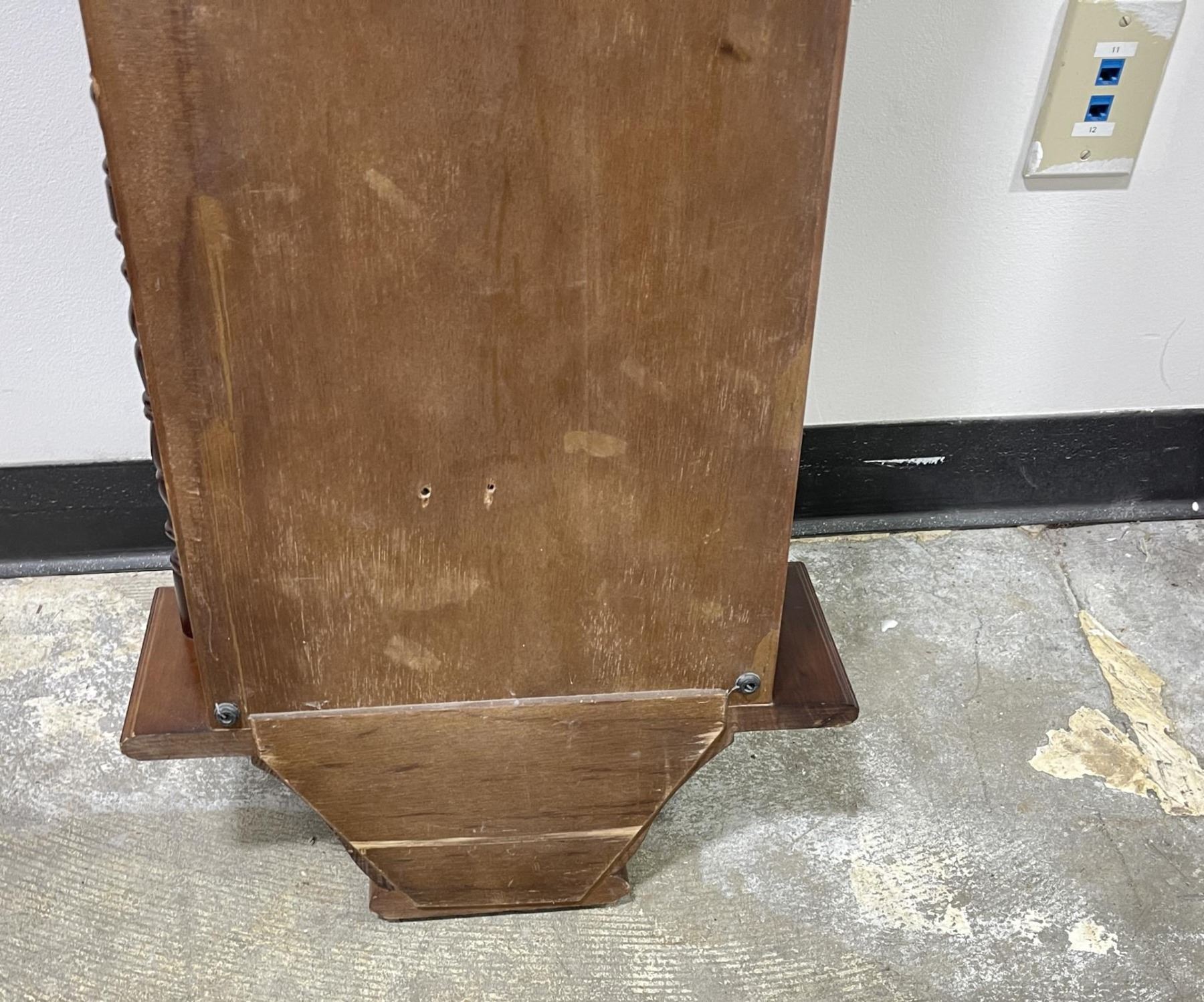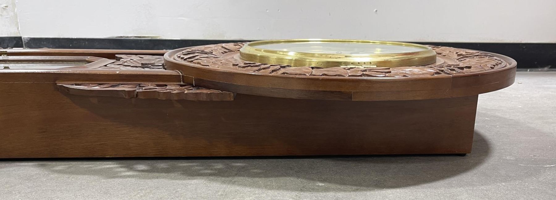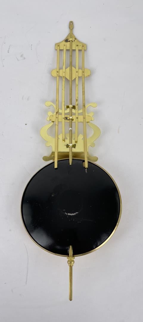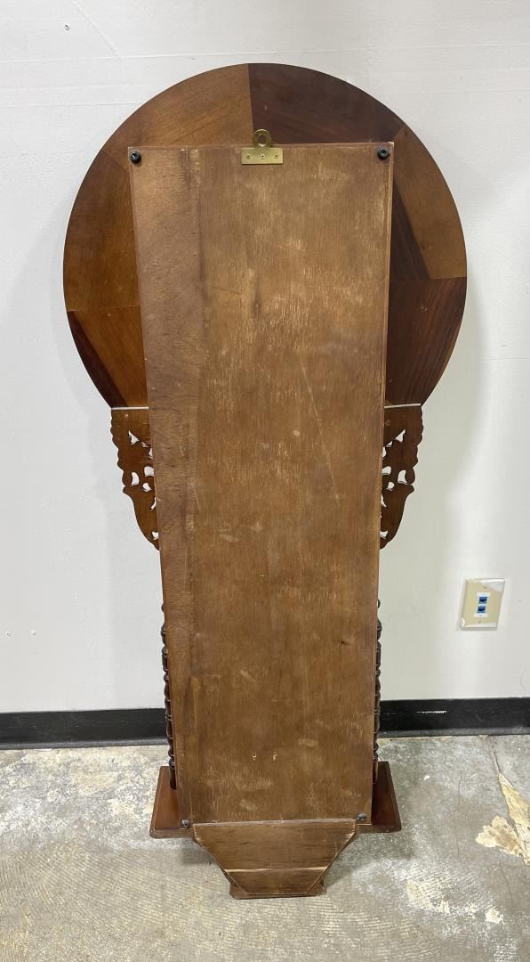 Will be very expensive to ship. Has pendant as shown. Front latch broken. Large clock. 52" tall. Will be very expensive to ship.