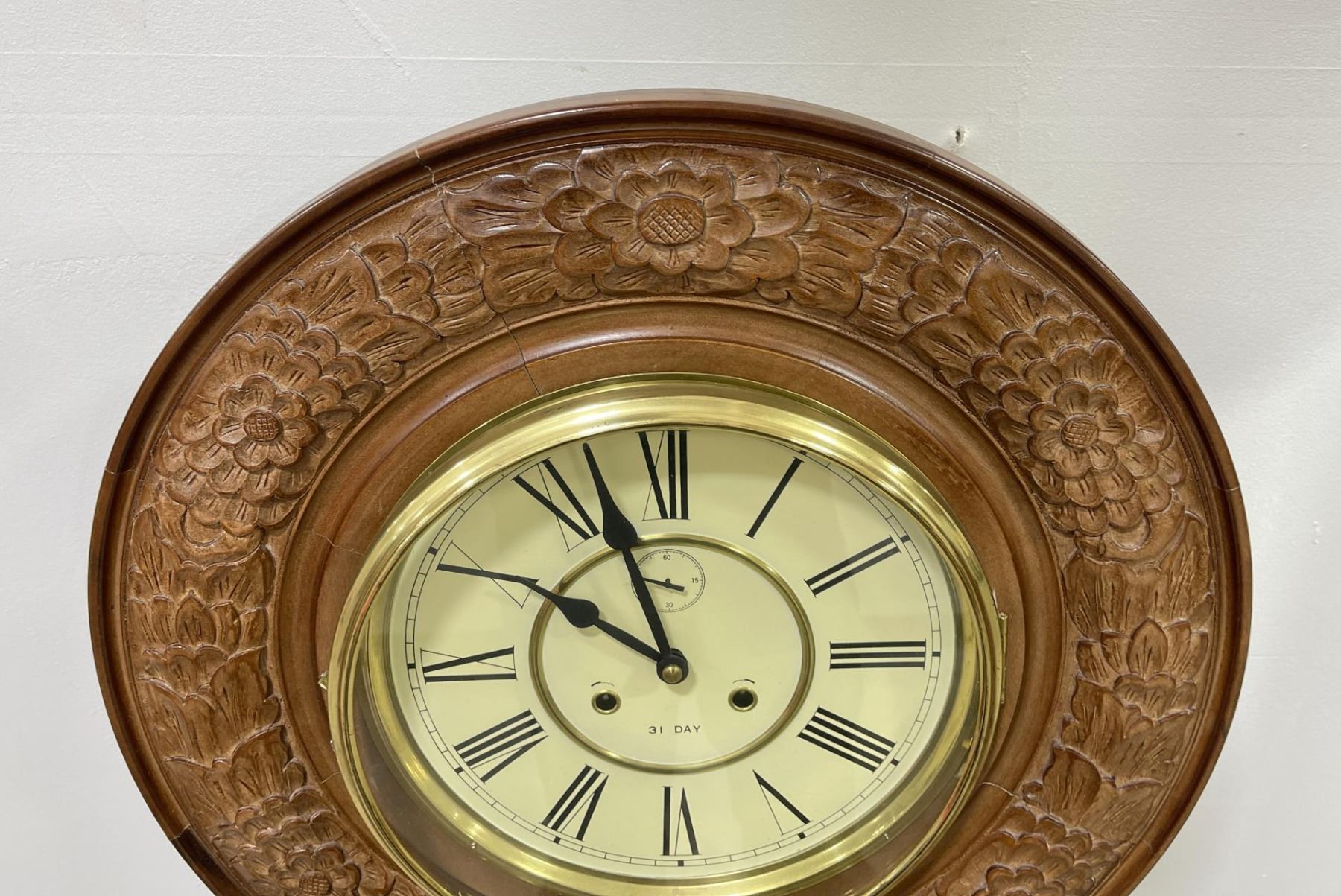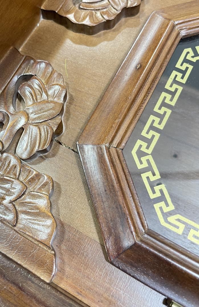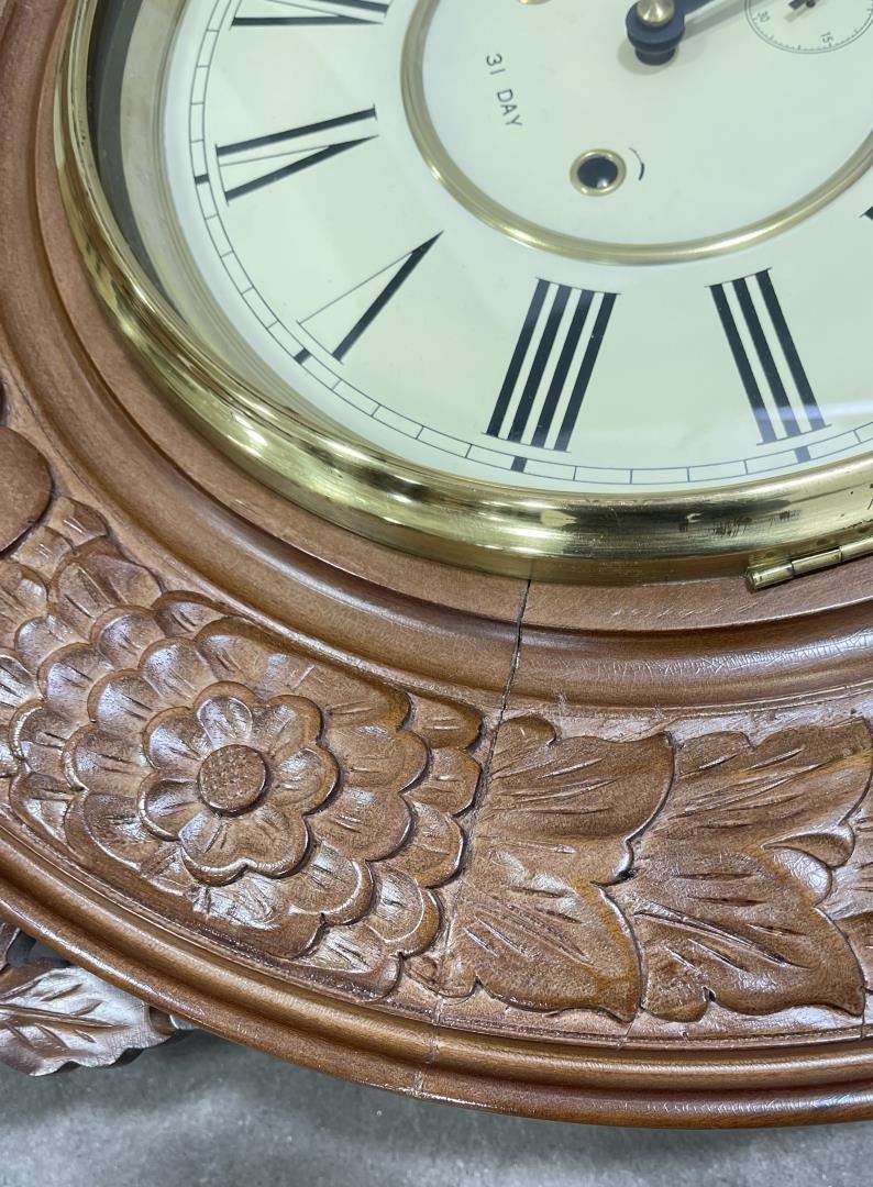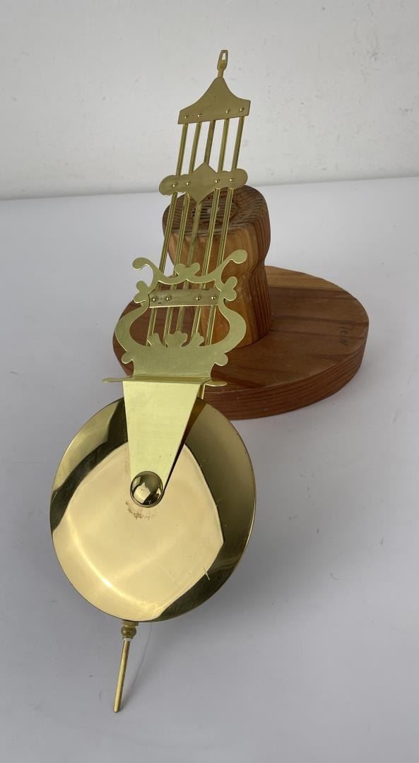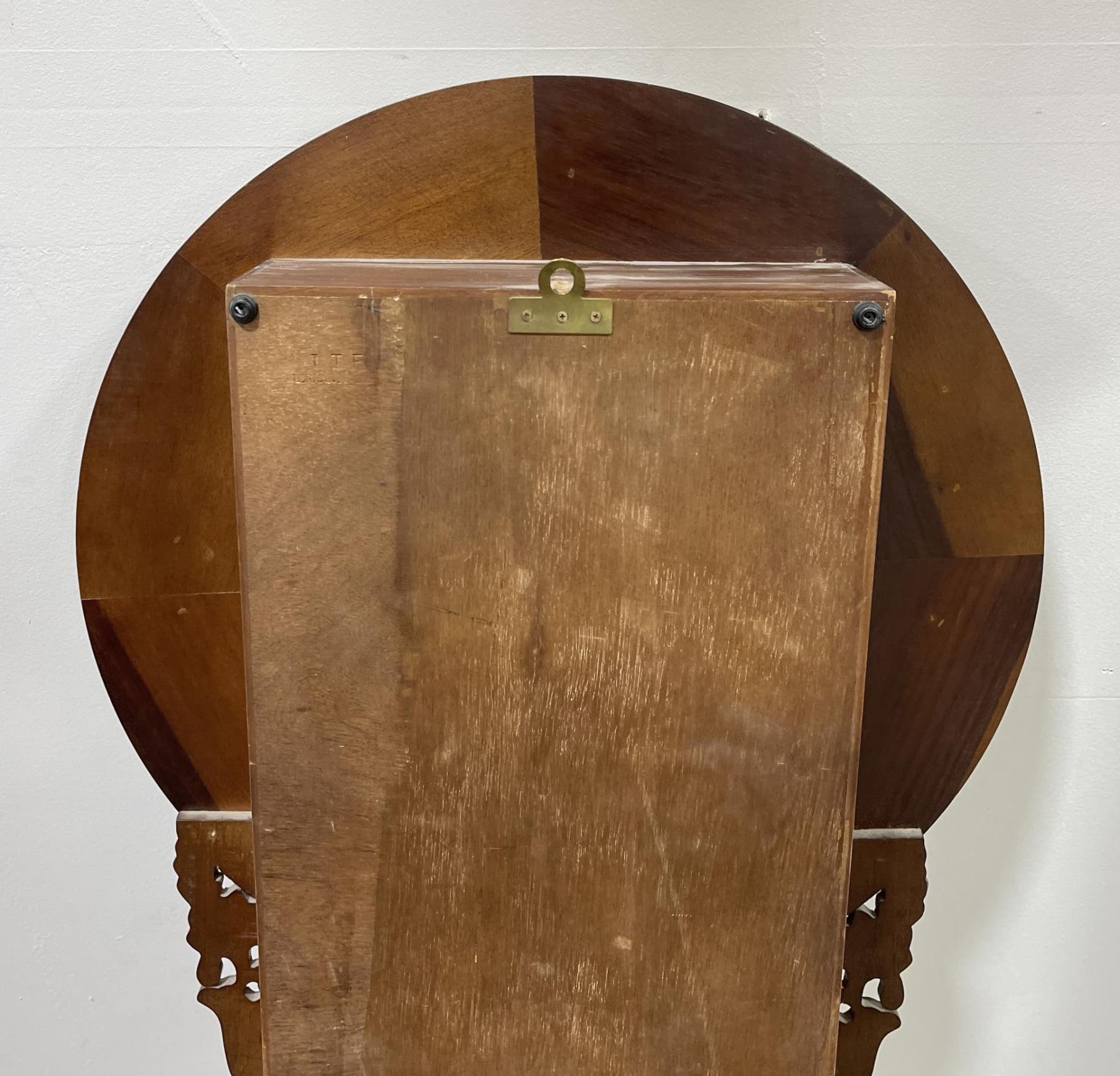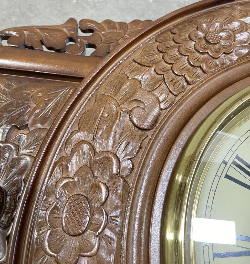 Will be very expensive to ship. Has pendant as shown. Front latch broken. Large clock. 52" tall. Will be very expensive to ship.