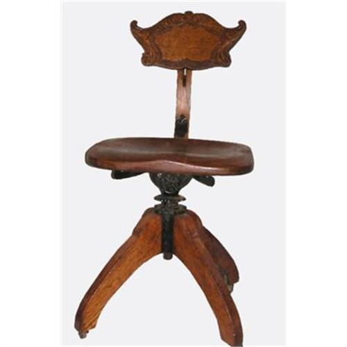 This is an ornate and sturdy chair, built to last. It is made of solid quarter sawn oak. The underside seat is stamped: "4345-2 OAK." The back of the seat is decoratively carved and the four curved legs have wooden castor wheels.