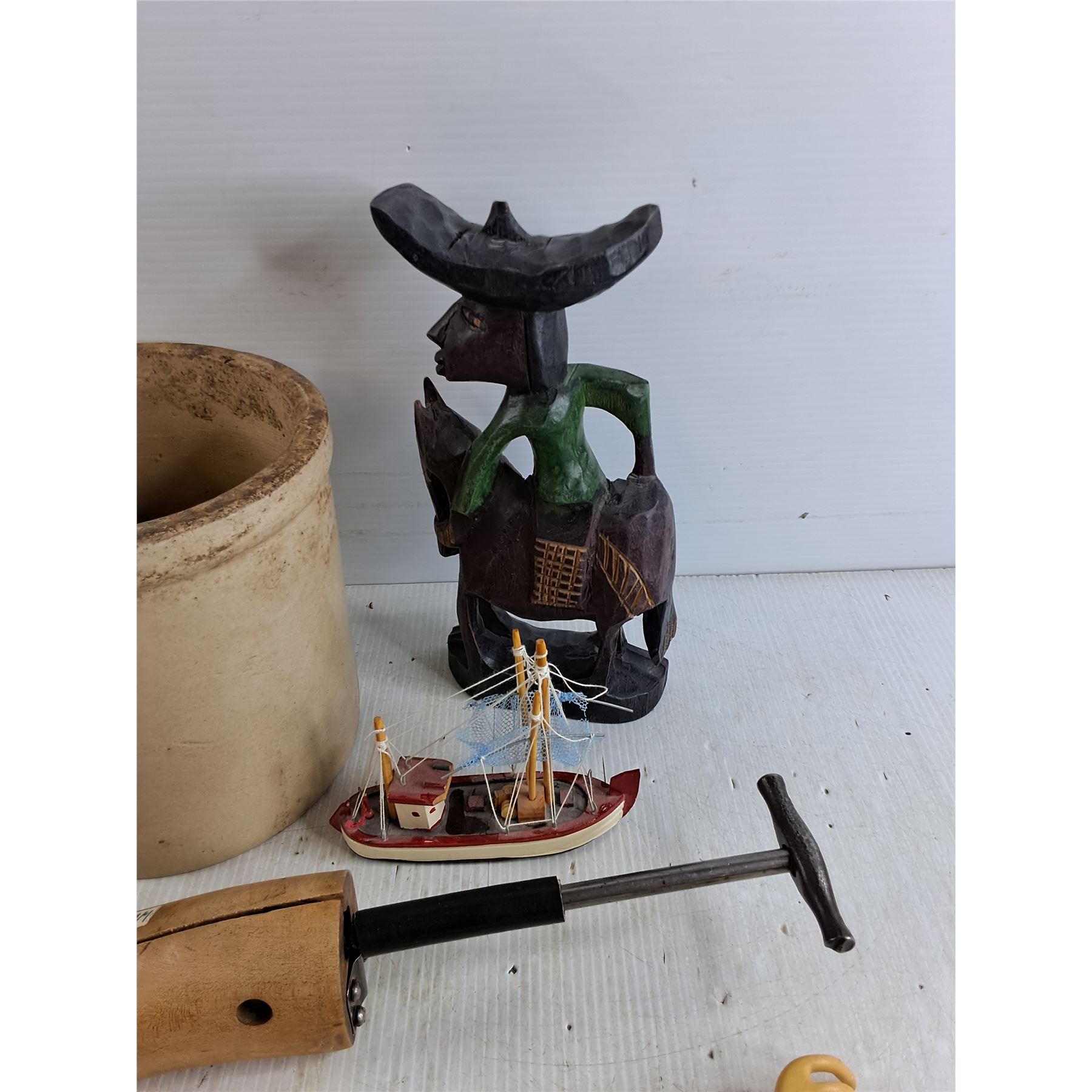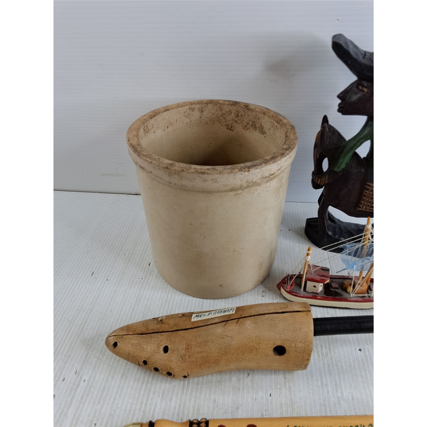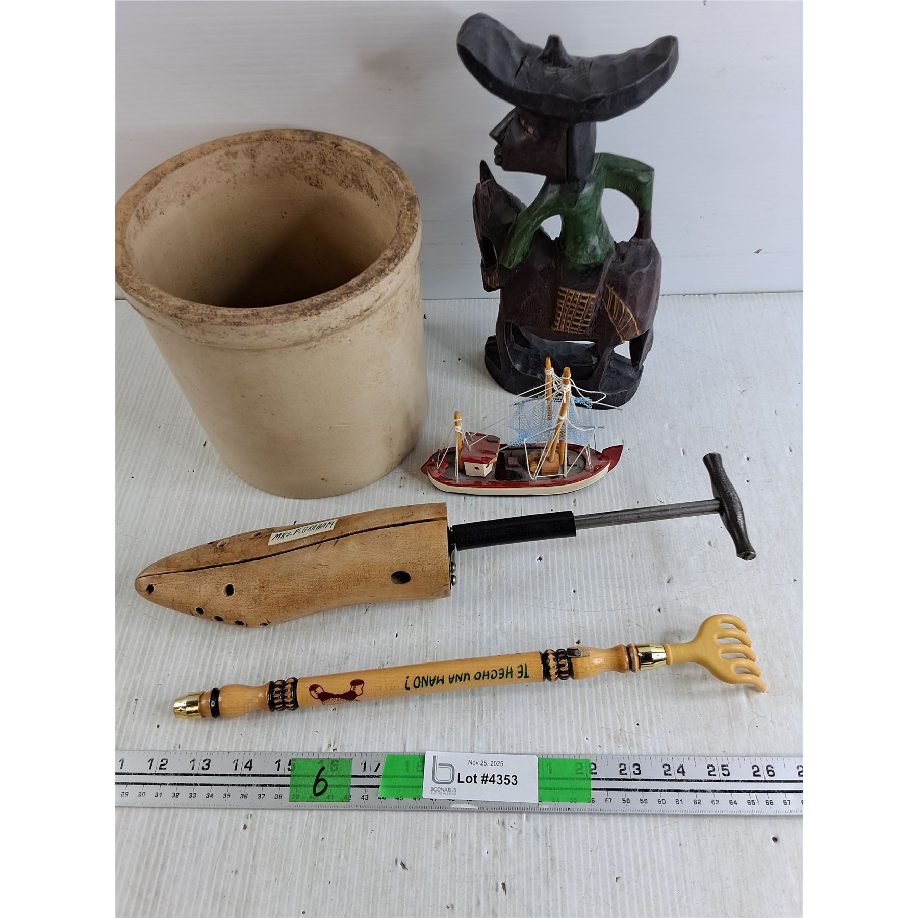 Carved Wood Cowboy, Back Scratcher, Miniature Ship, Crock Pot 7" x 7", Shoe Stretcher