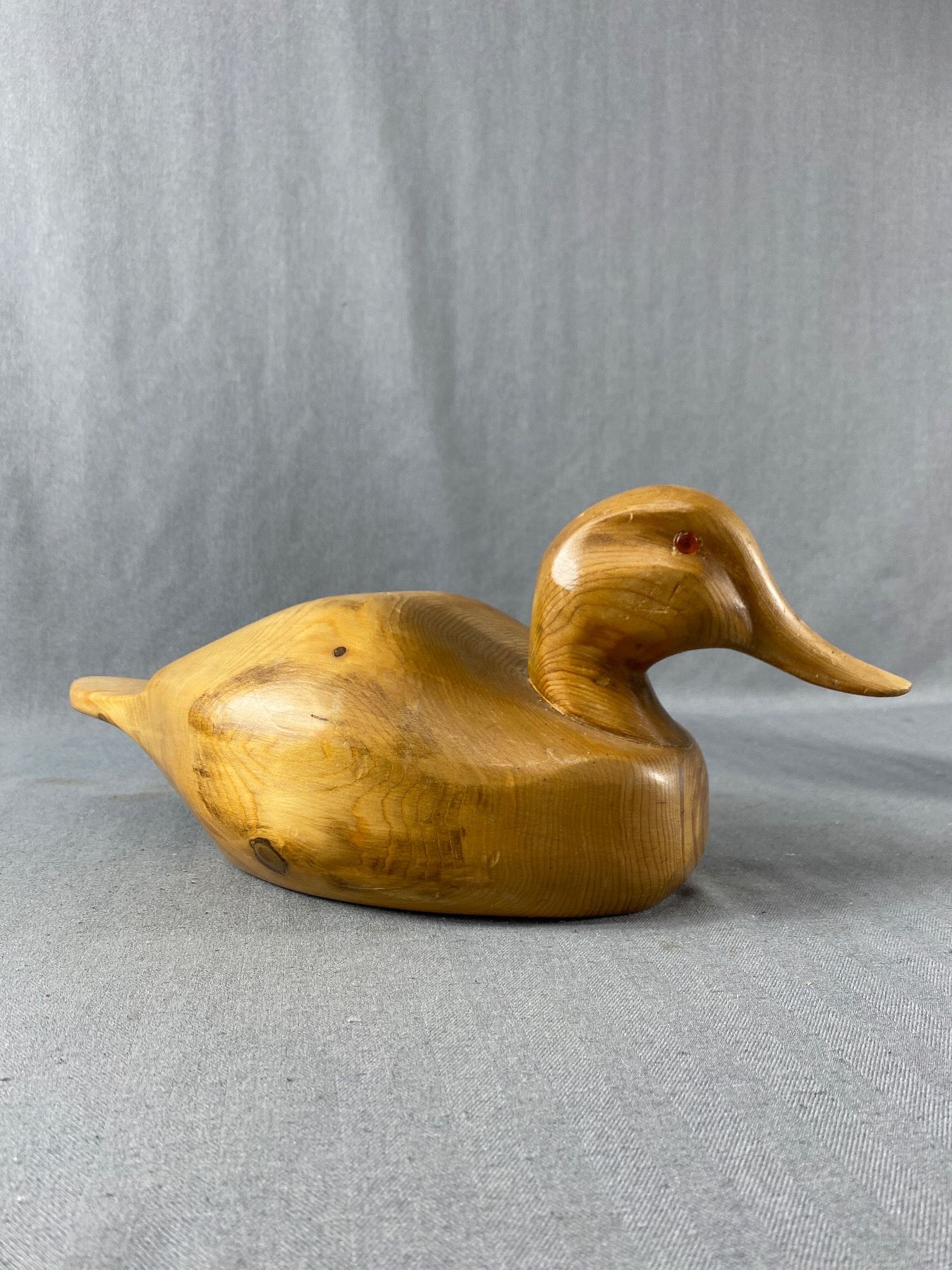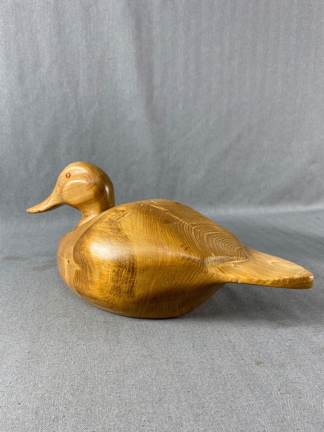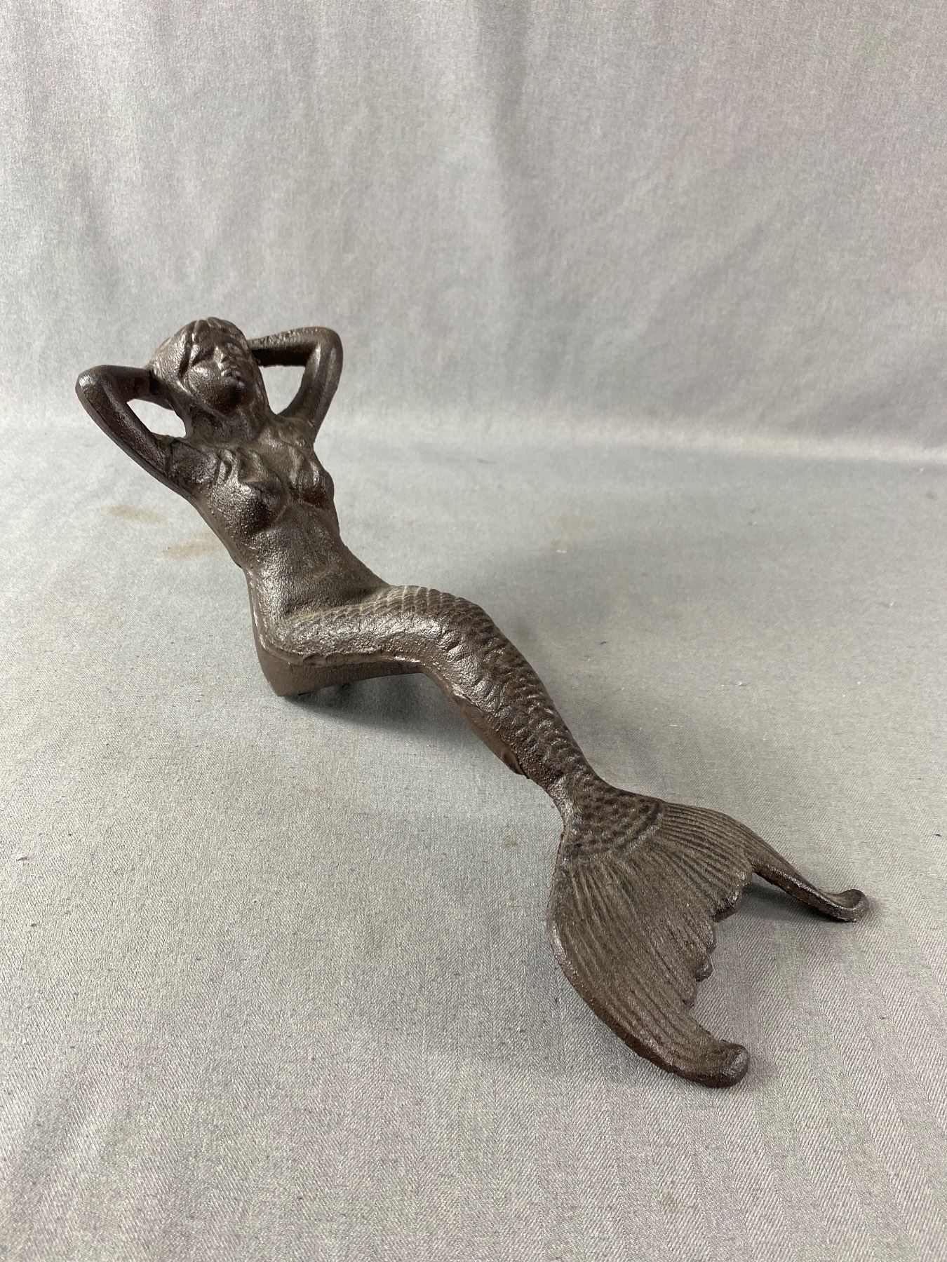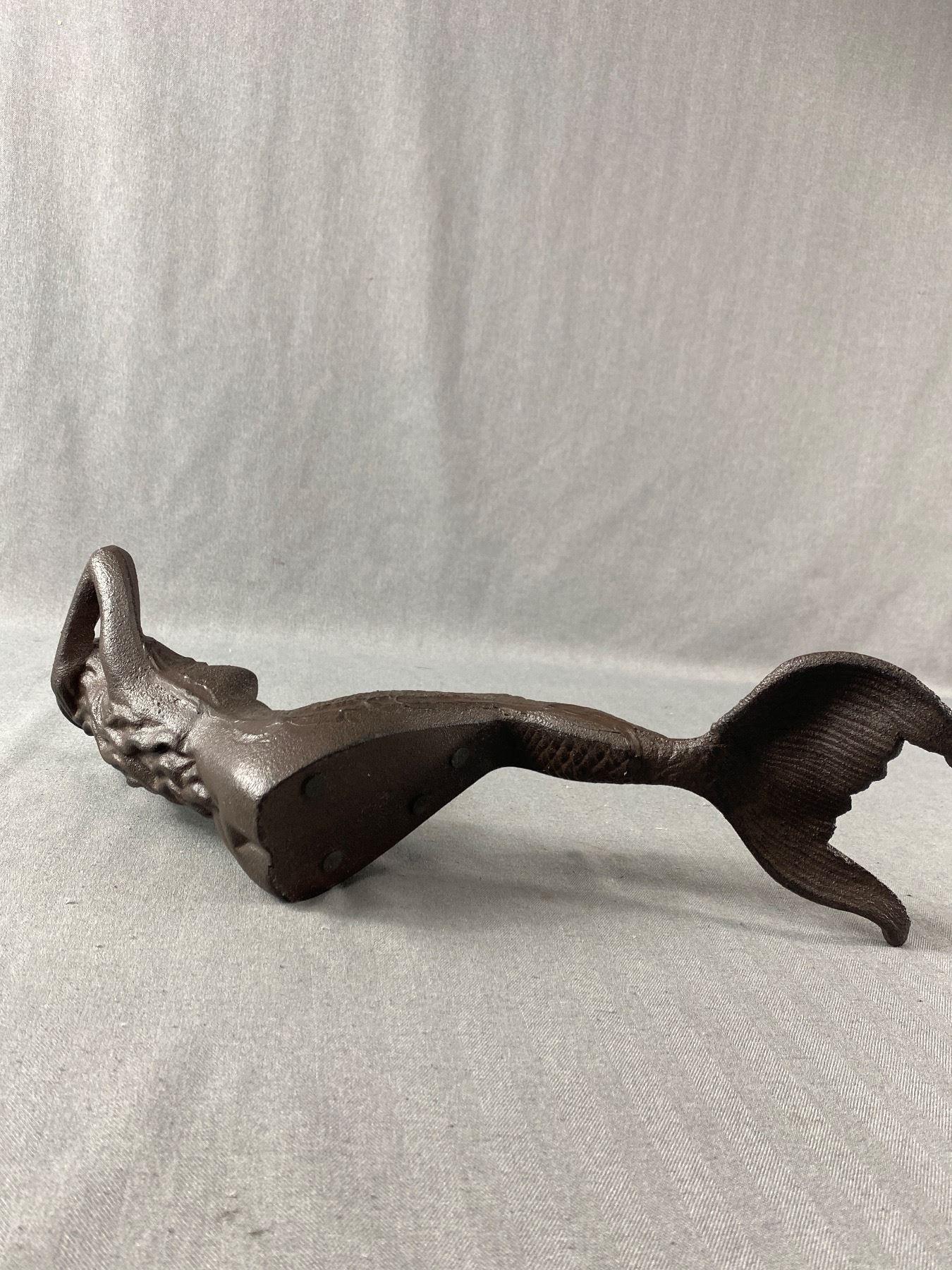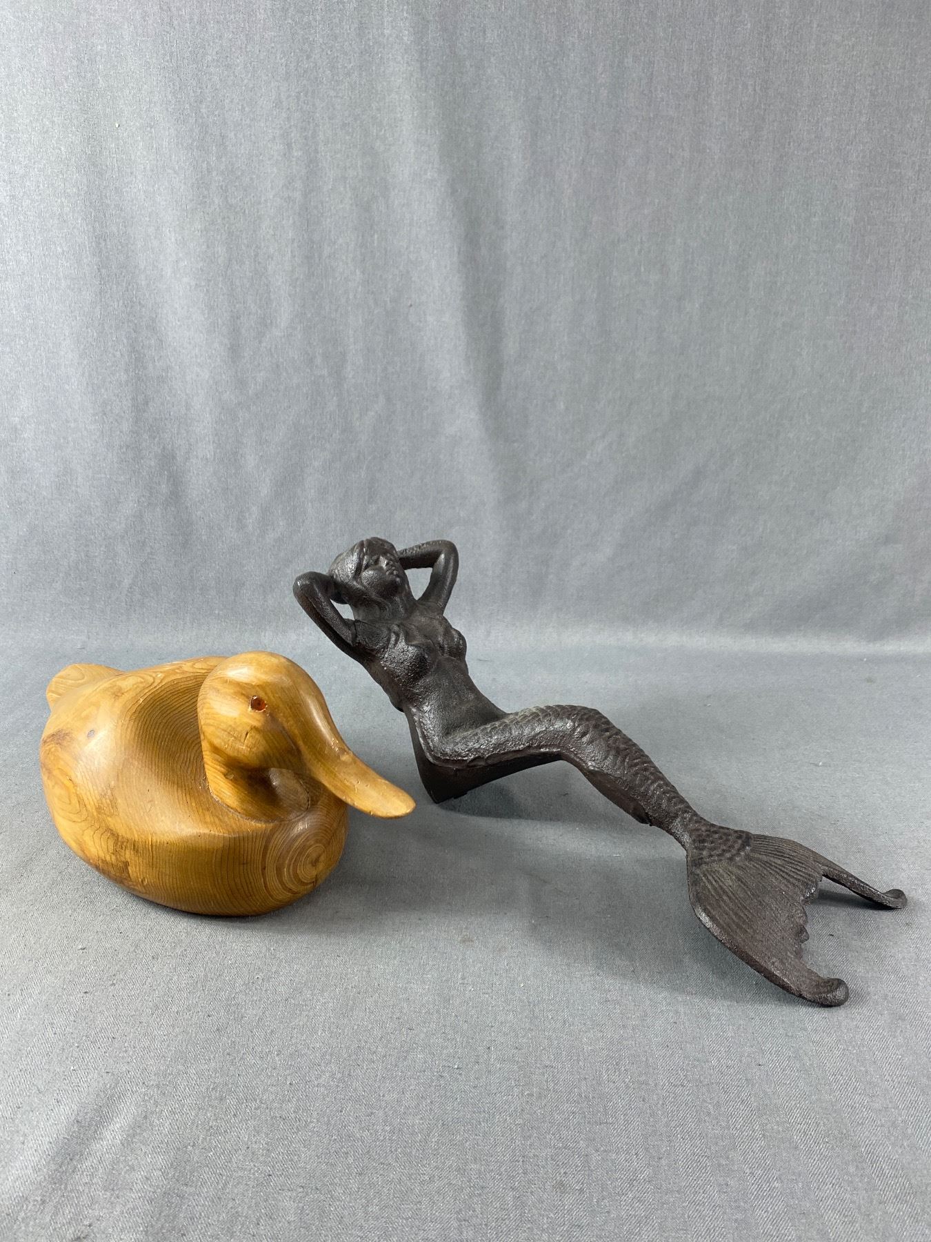 Carved Wood Duck Approx. 16" L & Heavy Metal Mermaid Shelf Sitter. Approx. 17" H