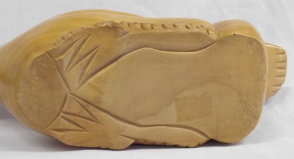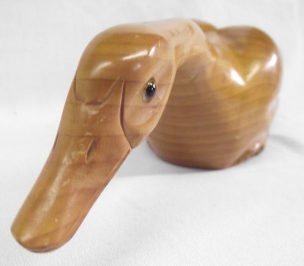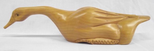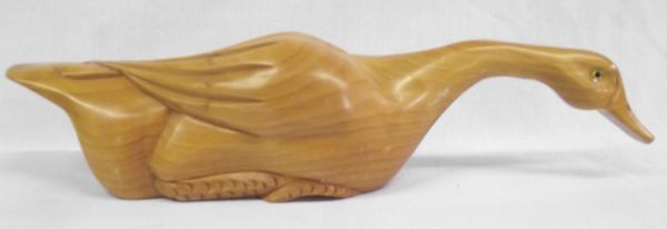 Carved Wood Goose. Realistic carving of a goose with his legs tucked under him. Beautiful honey colored wood. The goose has glass eyes and measures 13''Lx3''H.