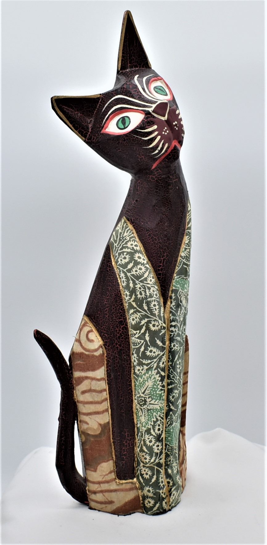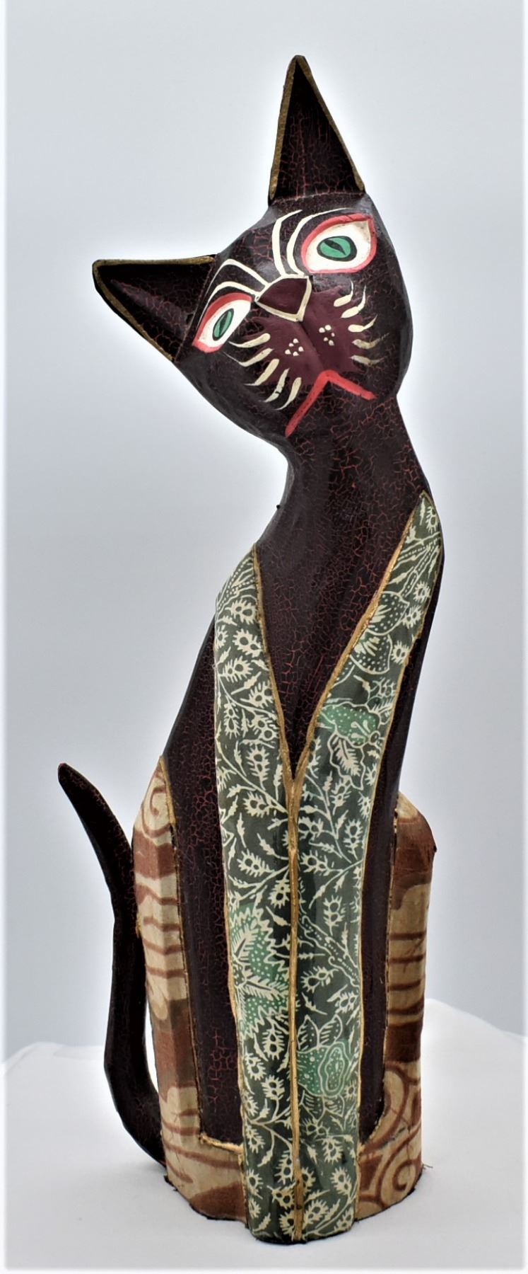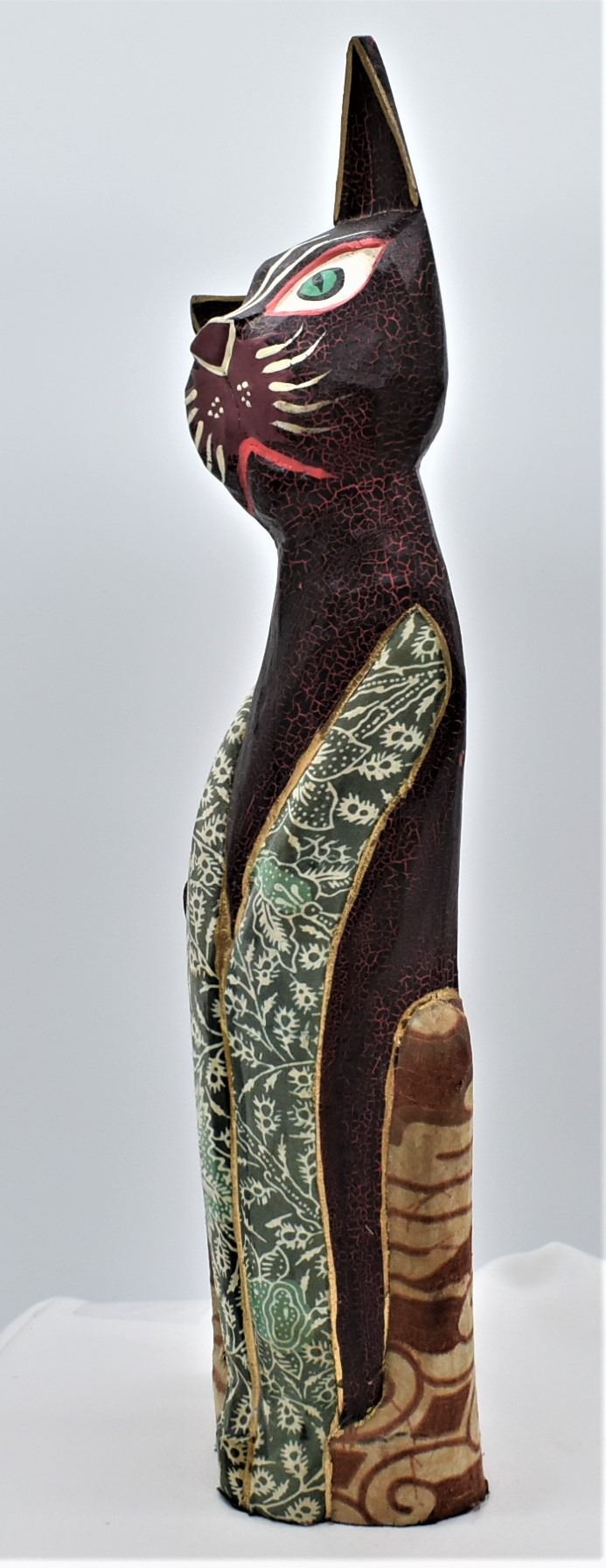 Carved Wood Hand Painted Cat Statue, embellished with fabric, likely African or Indonesian