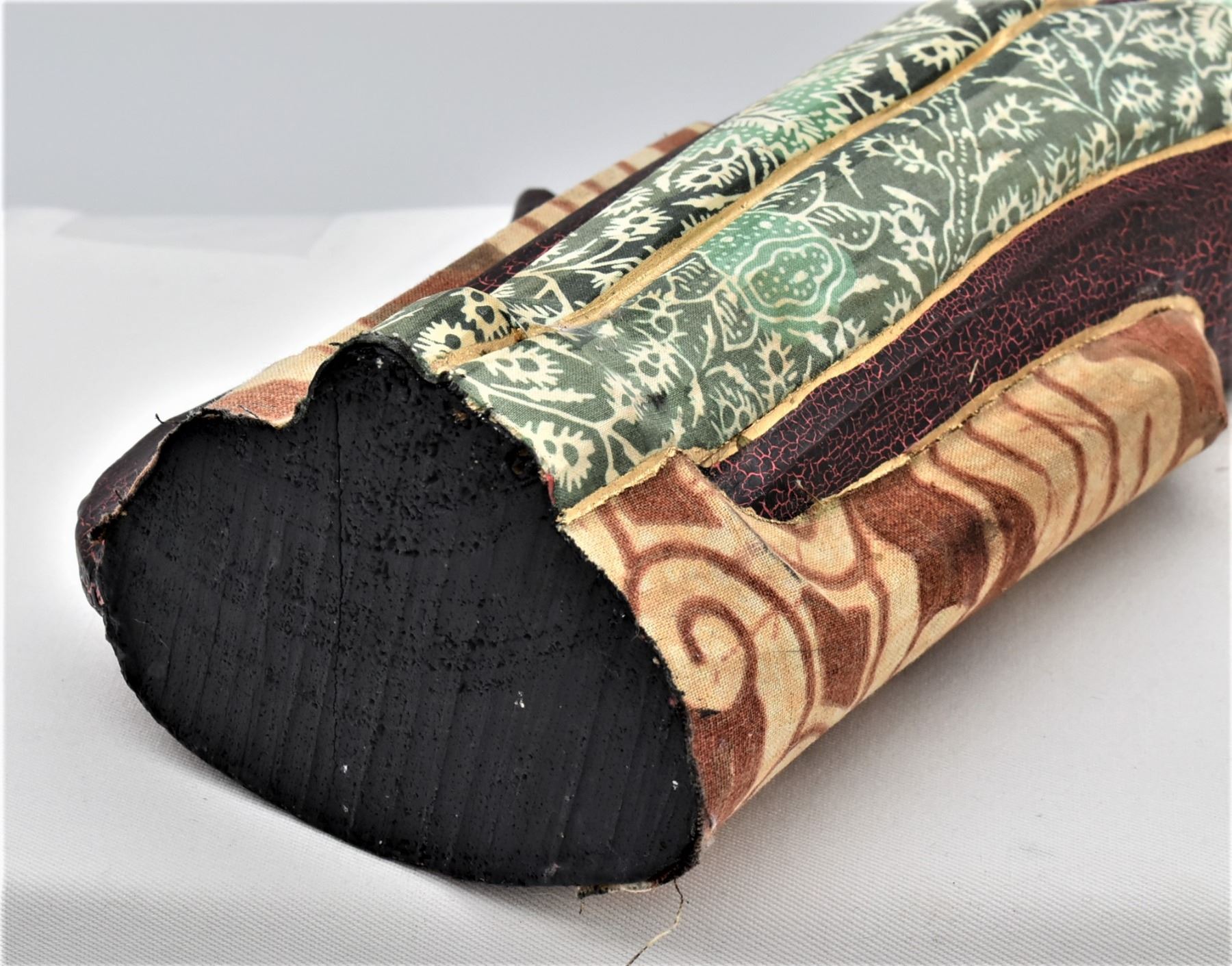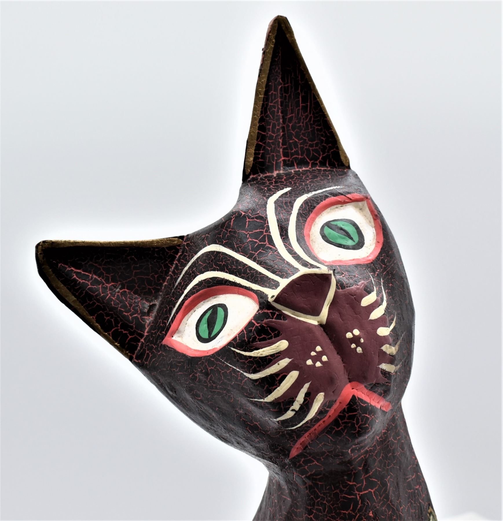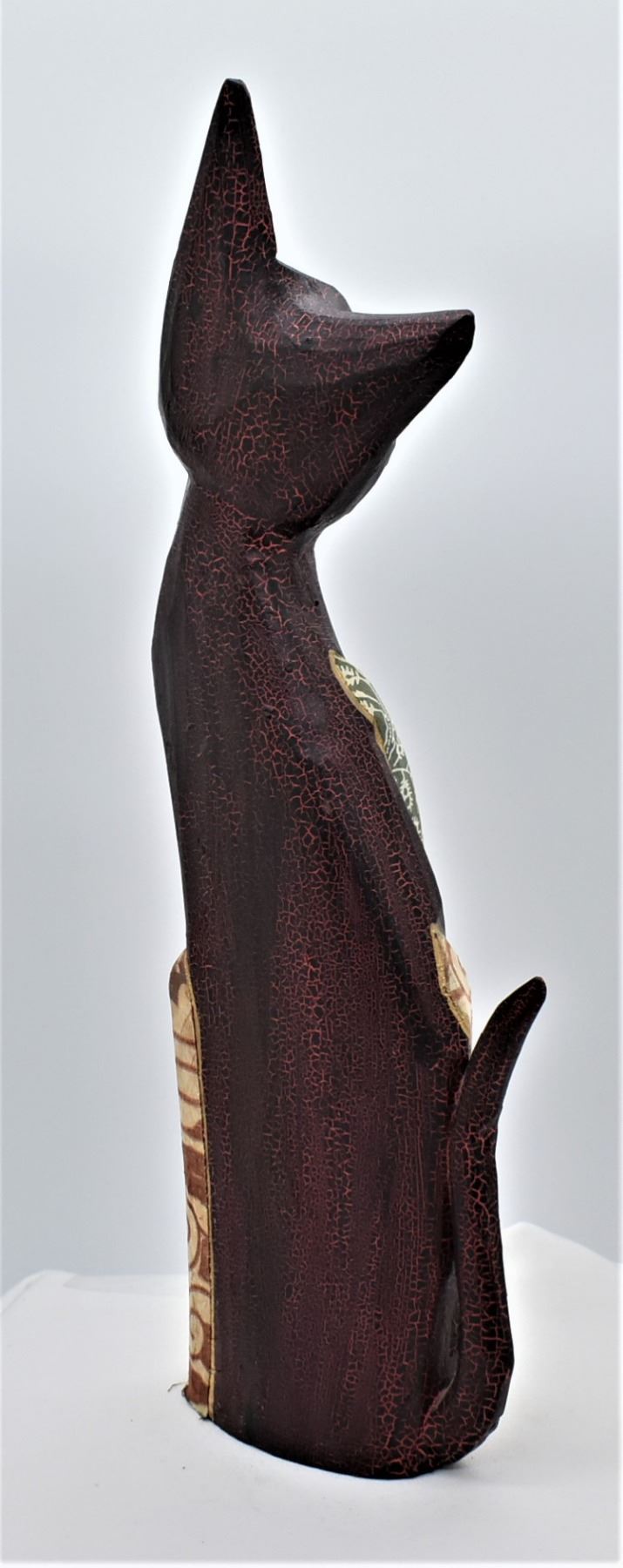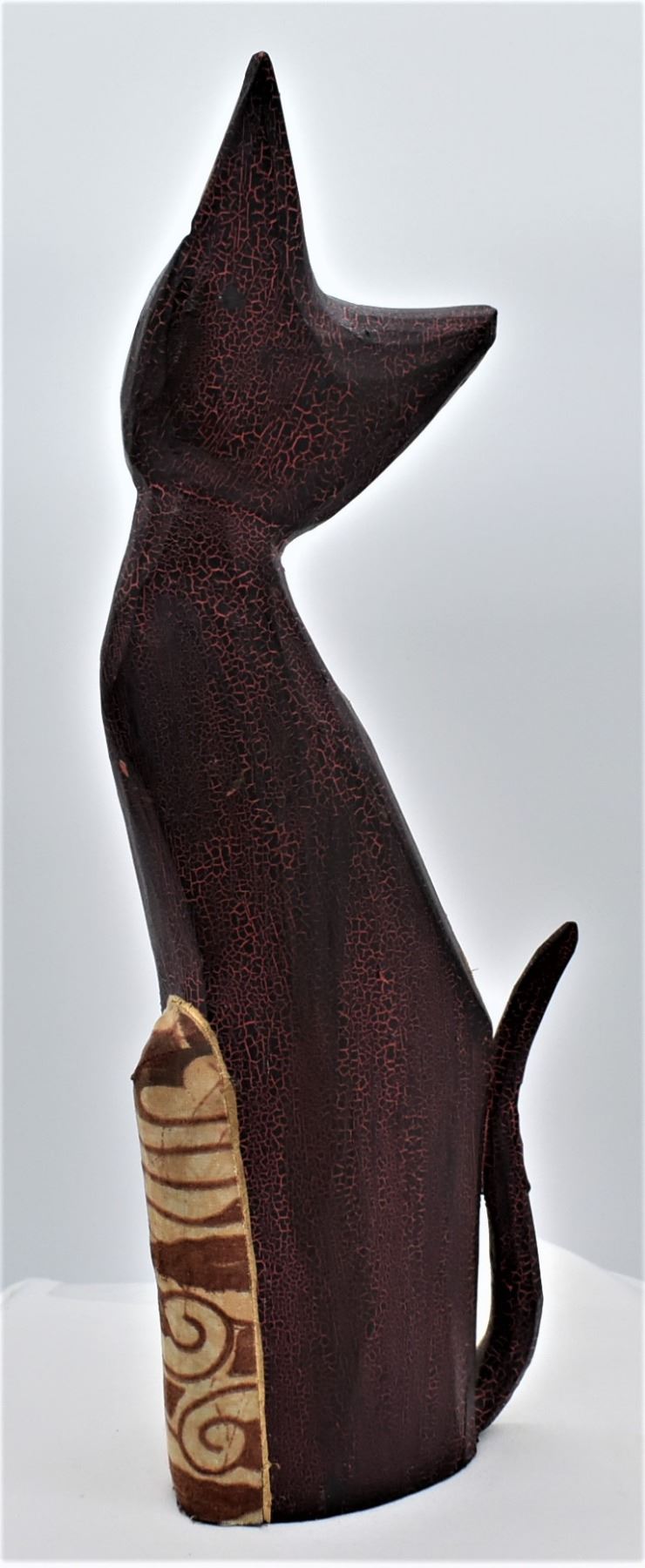 Carved Wood Hand Painted Cat Statue, embellished with fabric, likely African or Indonesian