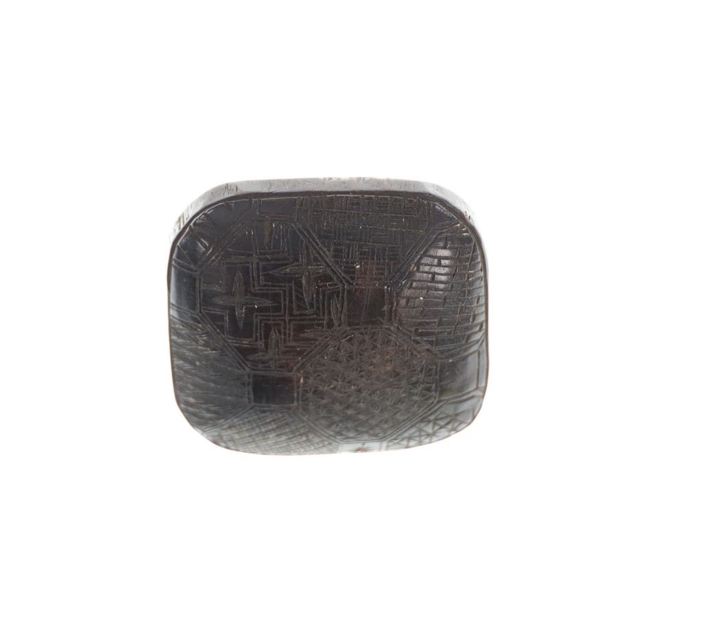 Featured in this lot is a late 19th Century Carved Wood Manju Rice Cake Netsuke, Meiji Period. Provenance: the Owen D. Mort, Jr. Collection. Owen David Mort was an American engineer who amassed an impressive collection throughout his worldwide travels. His collection has included art, artifacts and other historical items from which he has donated to museums at the University of Utah and the Snite Museum of Art at the University of Notre Dame, including African, Afghan and Asian artifacts. A netsuke is a miniature sculpture, originating in 17th century Japan. Initially a simply-carved button fastener on the cords of an inro box, netsuke later developed into ornately sculpted objects of craftsmanship. The traditional Japanese dress, the Kimono, has no pockets to carry small items such as purses, medicine boxes (Inro), portable writing sets (Yatate), tobacco pouches, etc. Women carry them tucked in the sleeves, men suspend them on a cord passed behind their sash (Obi). These hanging objects are called Sagemono. To prevent them from falling, they are attached to a stopper or toggle, called Netsuke, firmly positioned on top of the sash. To be a Netsuke, the carving must have one or two holes (Himotoshi) to allow attachment to the Sagemono. These can be drilled or be a natural opening in the Netsuke design. Over a period of about 300 years Netsuke have evolved from simple practical objects into superb small and intricate carvings appreciated and collected all over the world. This piece of Netsuke is called Manju Netsuke - flat in shape, resembling a "rice cake". The most common materials used are ivory, wood (especially boxwood) and antlers. The craftsmanship is readily apparent in the intricate details of the geometric designs found on both sides. Nice patina exhibited throughout, measures 1.5"W x 1.5"L.