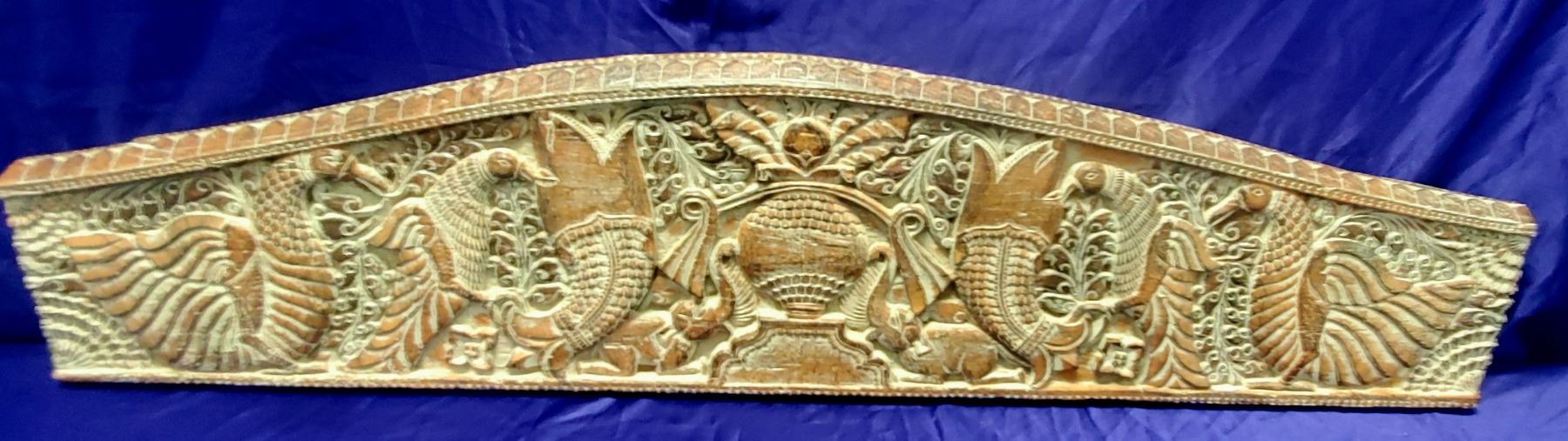 Indian carved wood panel. The highly detailed, unique panel depicts Elephants, Fish and Birds with flowers and beautiful scroll work. A fine work of Art. 11 inches H x 47 inches W x 1.75 inches D. In good condition.