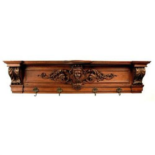 Heavily carved walnut wood wall rack. Designs include scrolls, leaves and faces. The center focus is a carved male face. Also featuring brass hooks with cherub designs. 55" wide, 13" tall, 5" deep. Reading for hanging and a great conversation piece. Mid 20th C.
