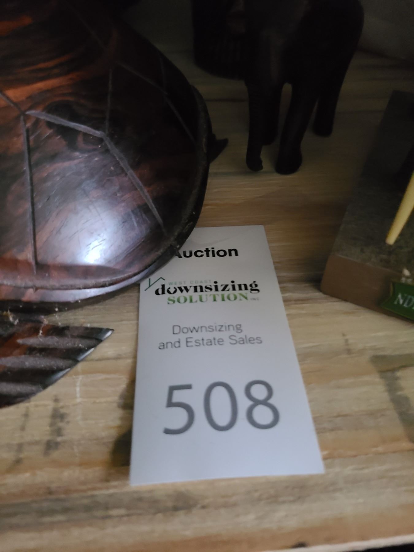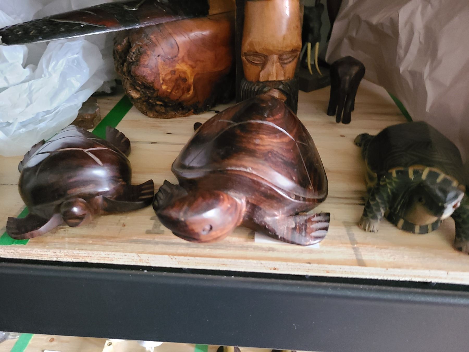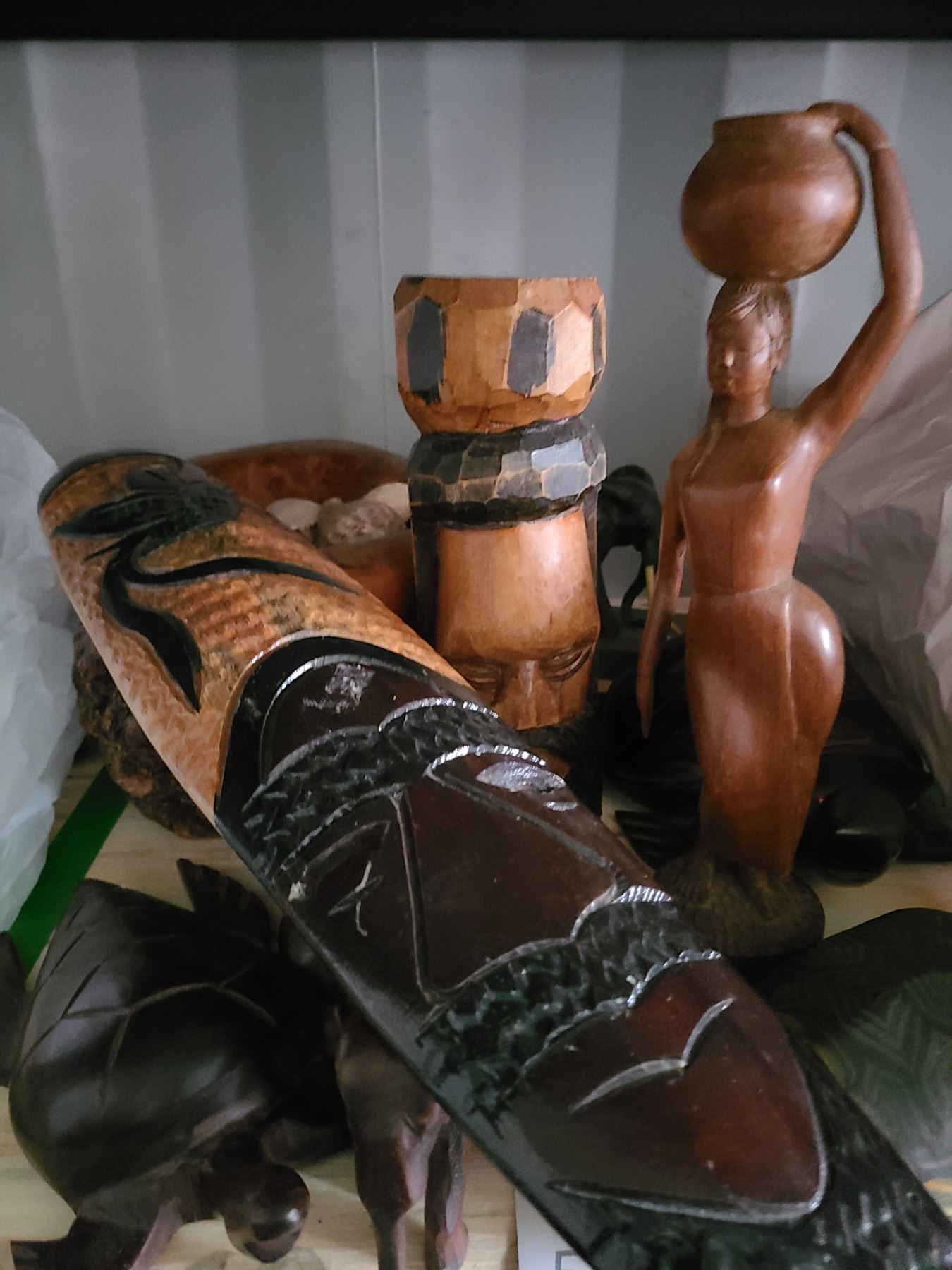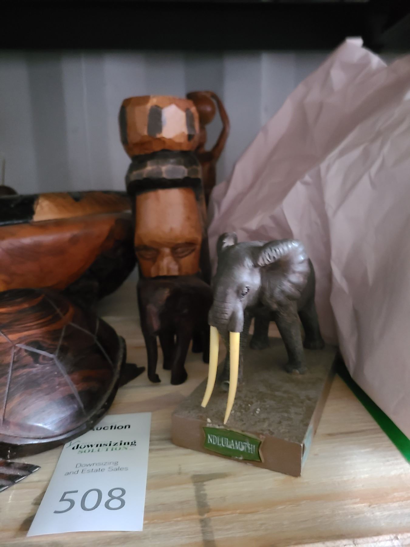 Carved animals, candle holder, bowl, and metal elephant on stand. Bring packing material. Pickup at 9 am.