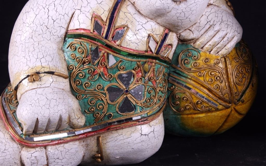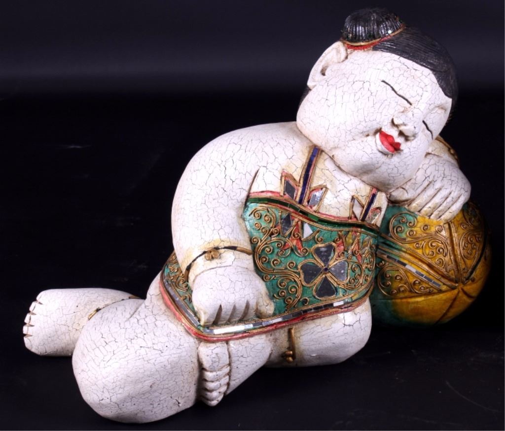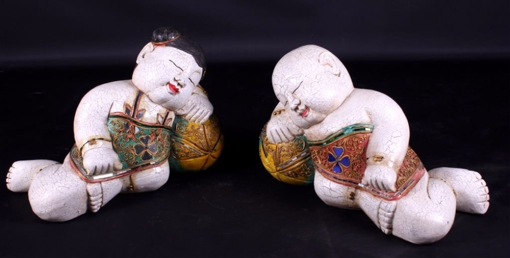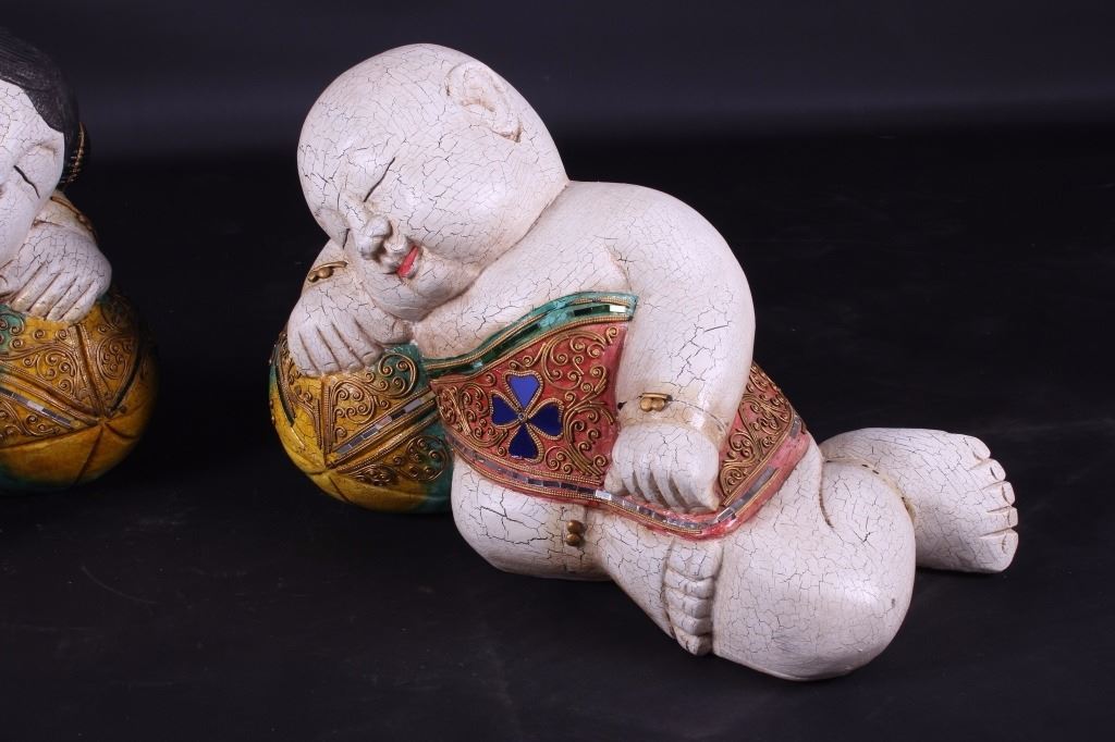This is a pair of carved wooden Buddha statues. These figures show a very relaxed, almost unconscious state. They are both in good condition. Each stature measures approximately 20" x 12" and is 13" tall.