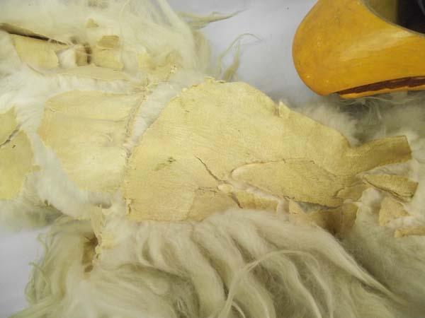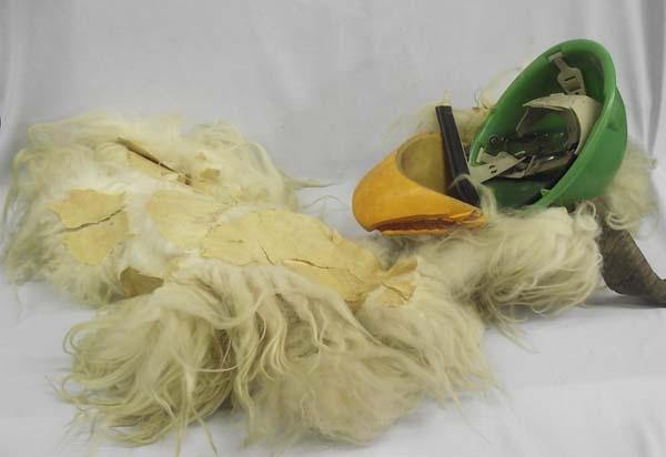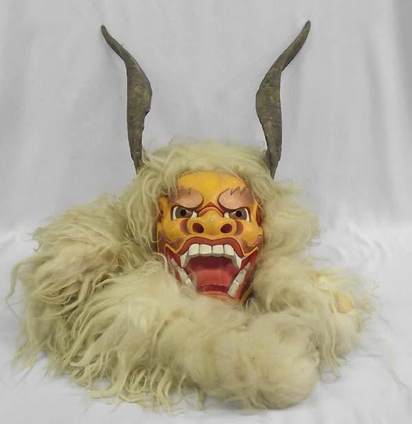 Carved Wooden Chinese Mask by Zarco Guerrero, mounted on a hardhat and has long wool mane, the mane has almost become detached from the mask, this mask has long curved sheep's horns and is carved in the likeness of the Chinese New Year's Dragon, mask measures approx. 12''L x 9''W, horns measure 14.5''L and 2''W, wool mane measures about 47''L. Buyers Pay Actual Shipping and Handling Charges(see terms and conditions for more information)