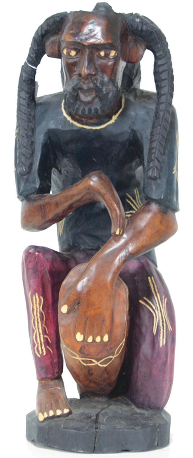 Mid/Late 1900s, Very large well carved and painted figure of a crouched man with a drum between his legs. 28" x 12" x 10"