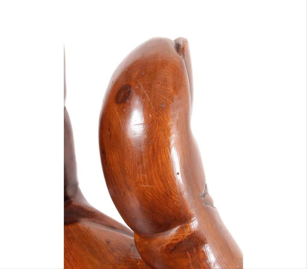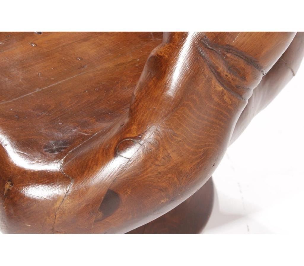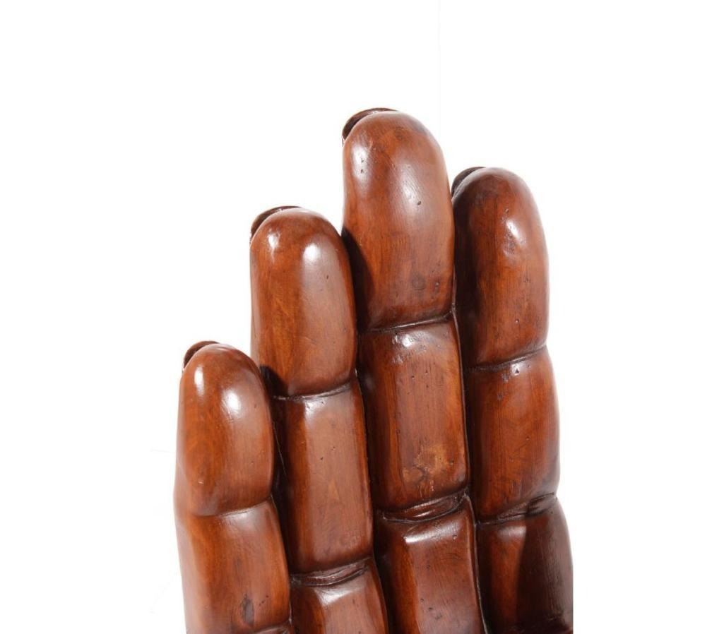 Pinewood carving in the form of a hand functioning as a chair. In a dark reddish brown finish. 40"H x 25"W x 24"D - 9080-012018-LA-0055A