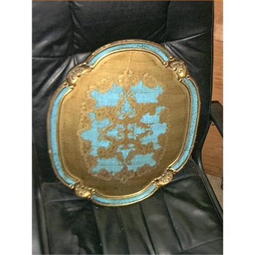 Carved Wooden Tray from Italy. This is very beautiful with Gold and blue detailed color and design. Very nicely done and in very nice condition. Does have some age to it that's for sure. The back is all colored gold. We did notice a very small nick in the side of the tray, hard to see it, but it is there. Just want you to know about it. If it wasn't there, we would ask a lot more for the tray. It did not take away from it's beauty and it is hard to notice. It is 20 1/4" L X 16 1/2" W X 3/4" Depth. Very colorful as you can see and it does say made in Italy on it. Hope you like it.