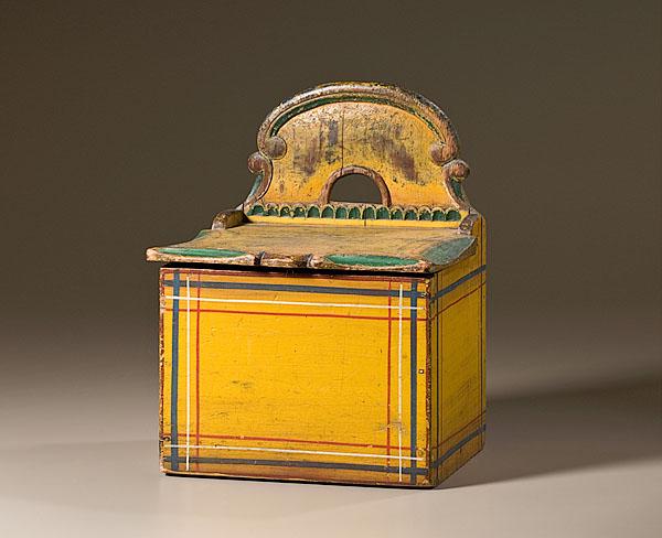 likely Canadian, mid to late 19th century. Hanging pine salt box with carved designs and bright colors typical of the French Canadian vernacular; 15" high 11.5" wide x 10" deep.