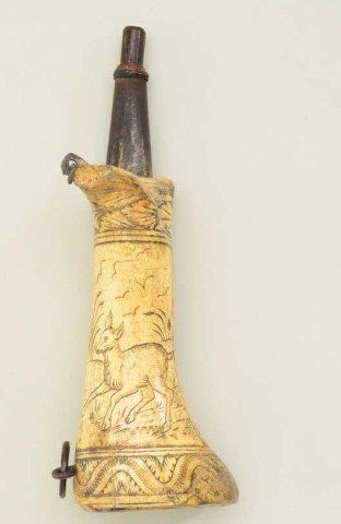 Carved bone Wheelock era powder flask showing scene of king playing harp and small fawn surrounded by scrolls. The flask measures 7-5/8” from tip to end and approximately 2-3/4” across the base. There has been somegluing and repairs using filler. Est. $300-$600