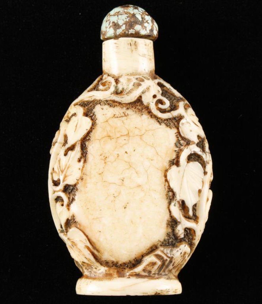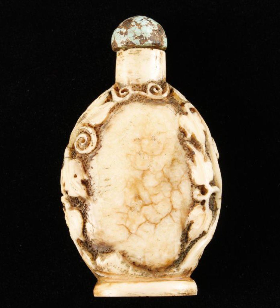 Carved fossilized bone snuff bottle with turquoise top. 18th to 19th century. Est.: $150-$300