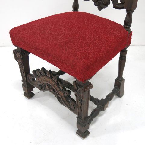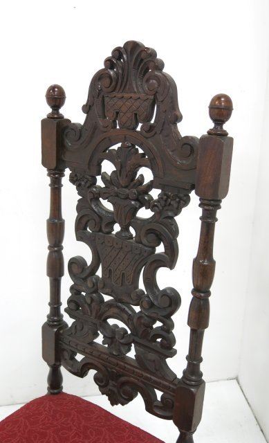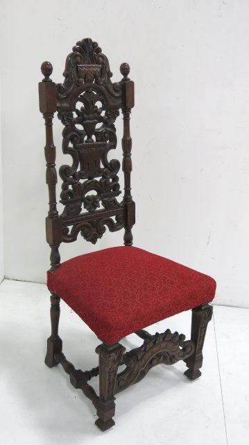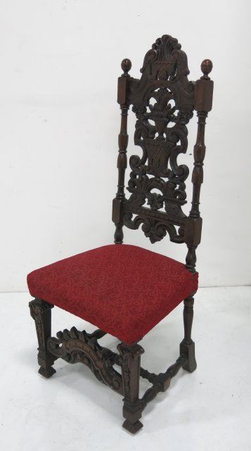 Ca. 1930s. Red upholstered seat. Carved basket of flowers design. Approx. 54" H.